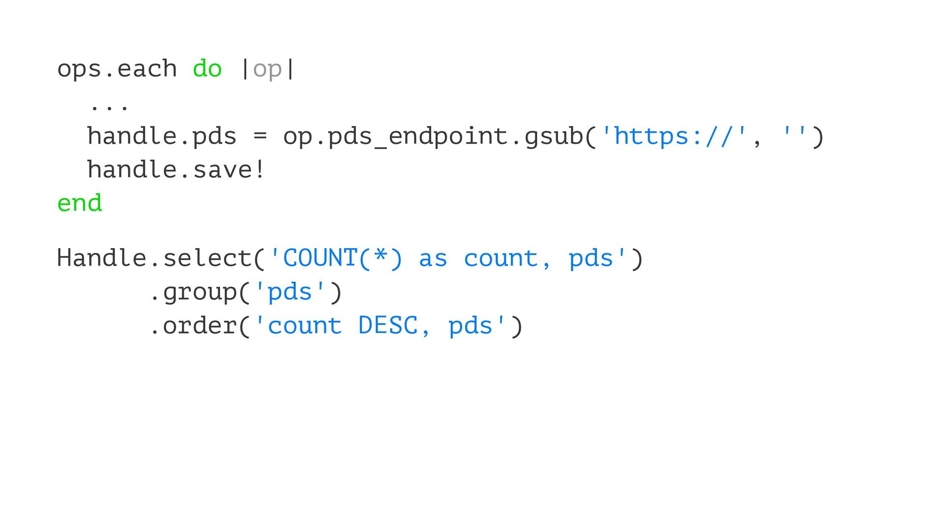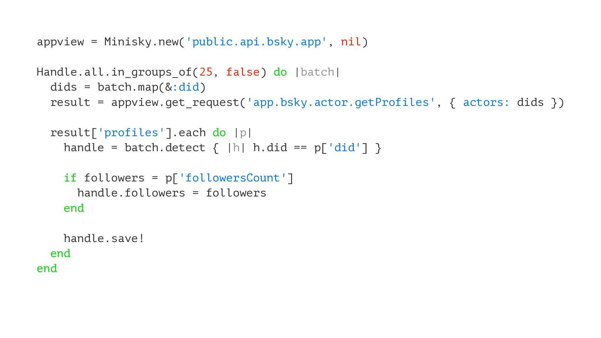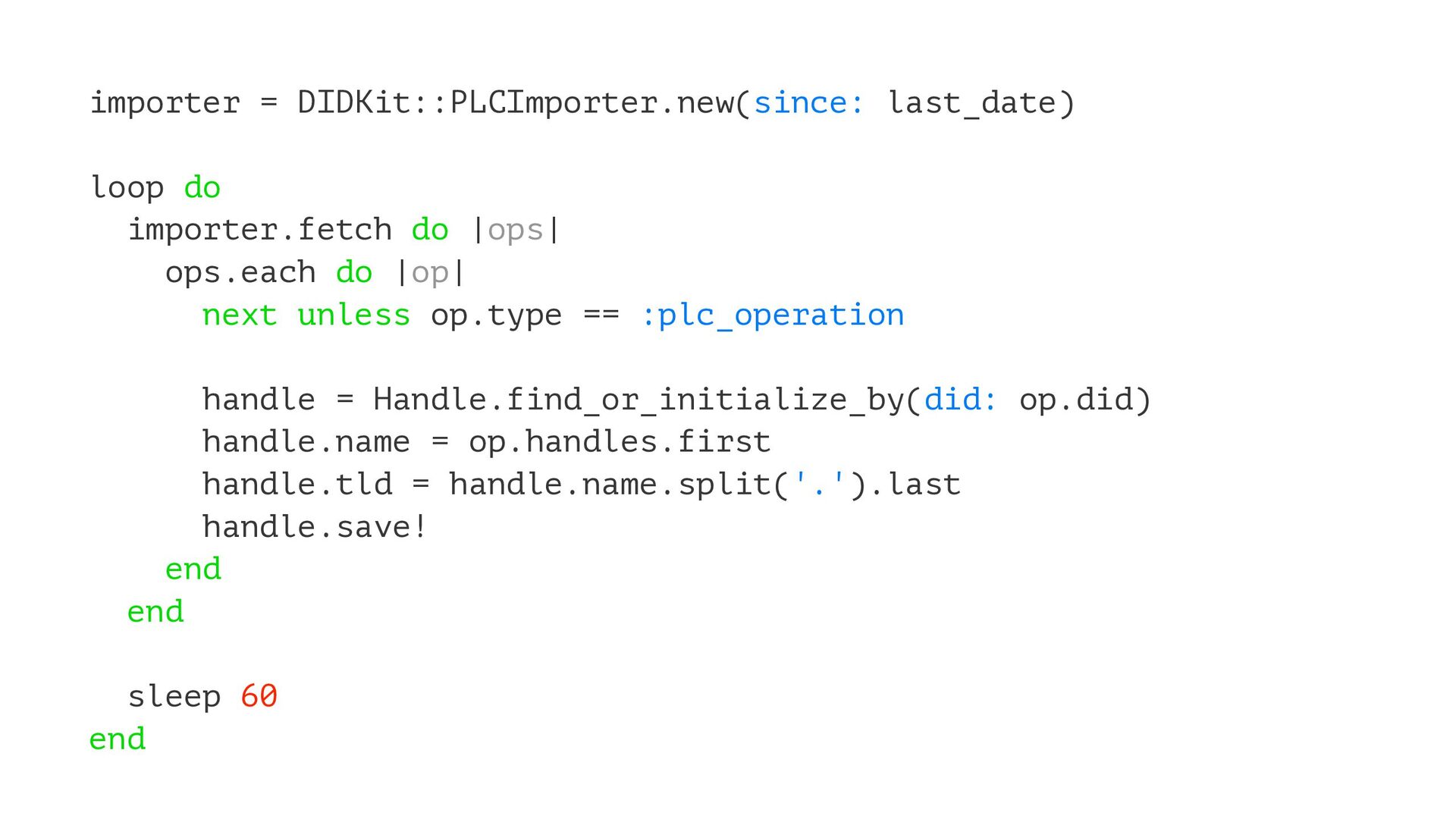 do |op| next unless op.type == :plc_operation handle = Handle.find_or_initialize_by(did: op.did) handle.name = op.handles.first handle.tld = handle.name.split('.').last handle.save! end end sleep 60 end