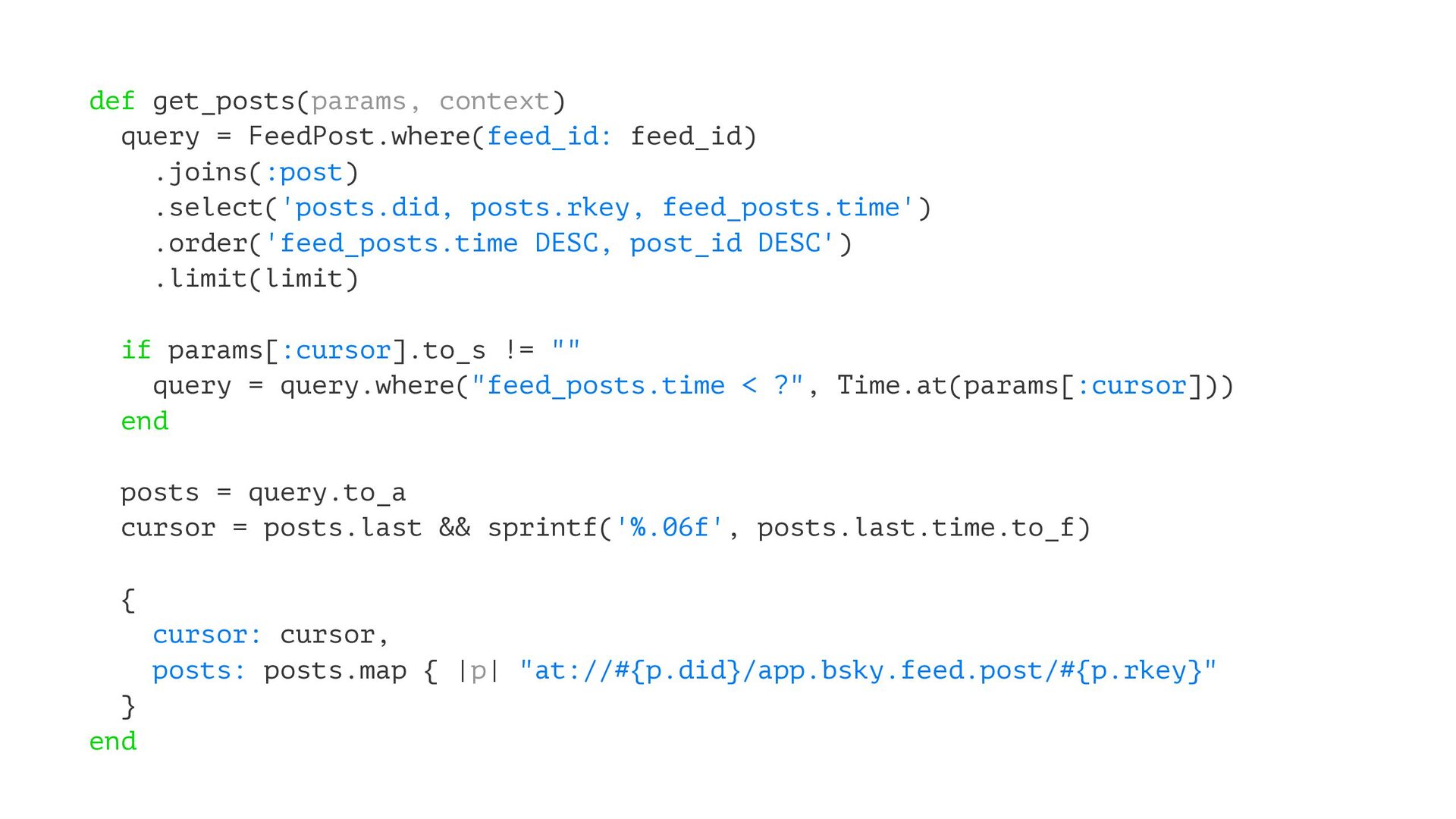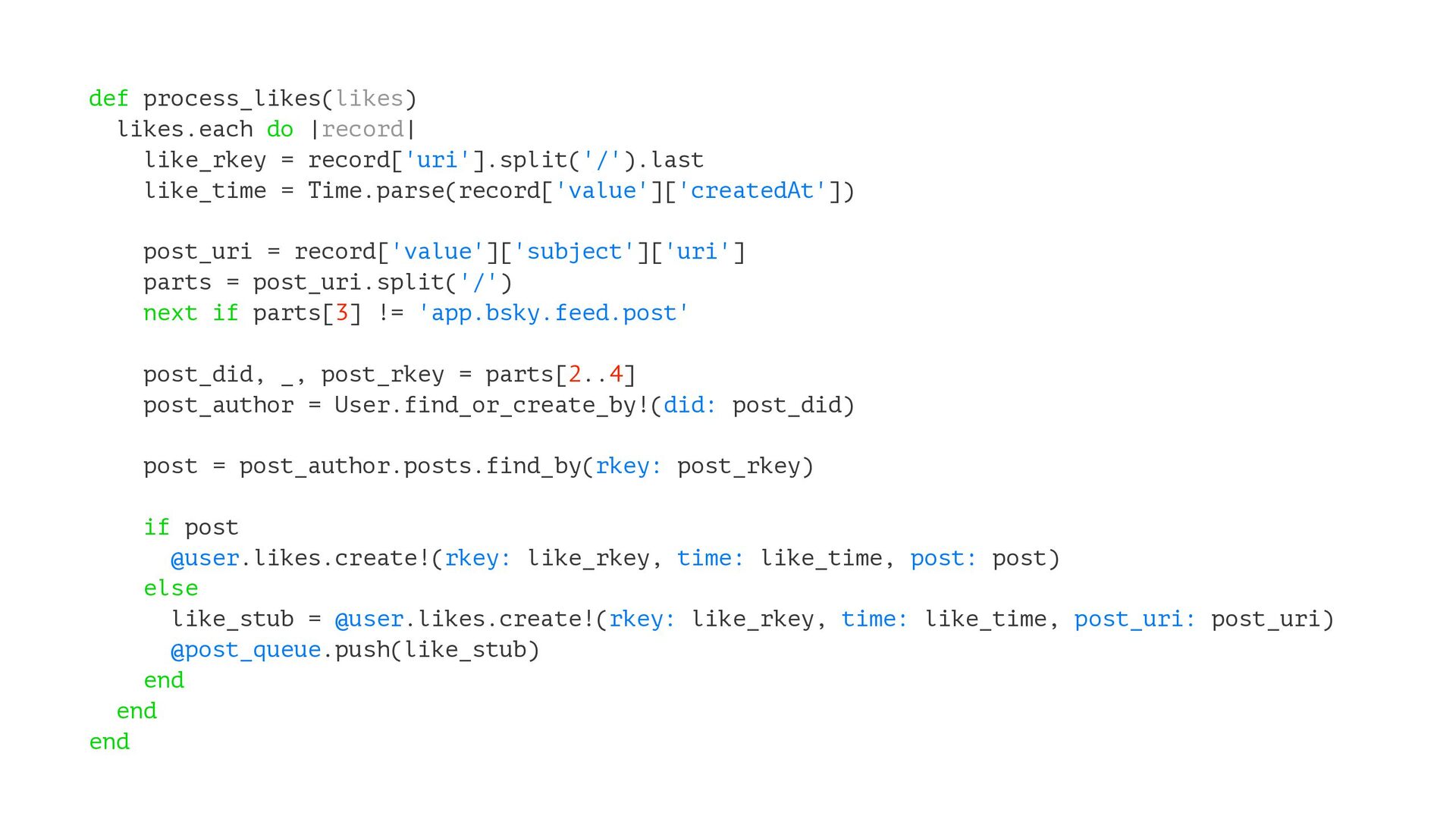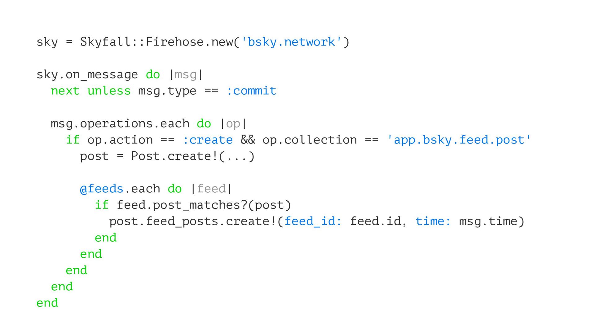 :commit msg.operations.each do |op| if op.action == :create && op.collection == 'app.bsky.feed.post' post = Post.create!(...) @feeds.each do |feed| if feed.post_matches?(post) post.feed_posts.create!(feed_id: feed.id, time: msg.time) end end end end end