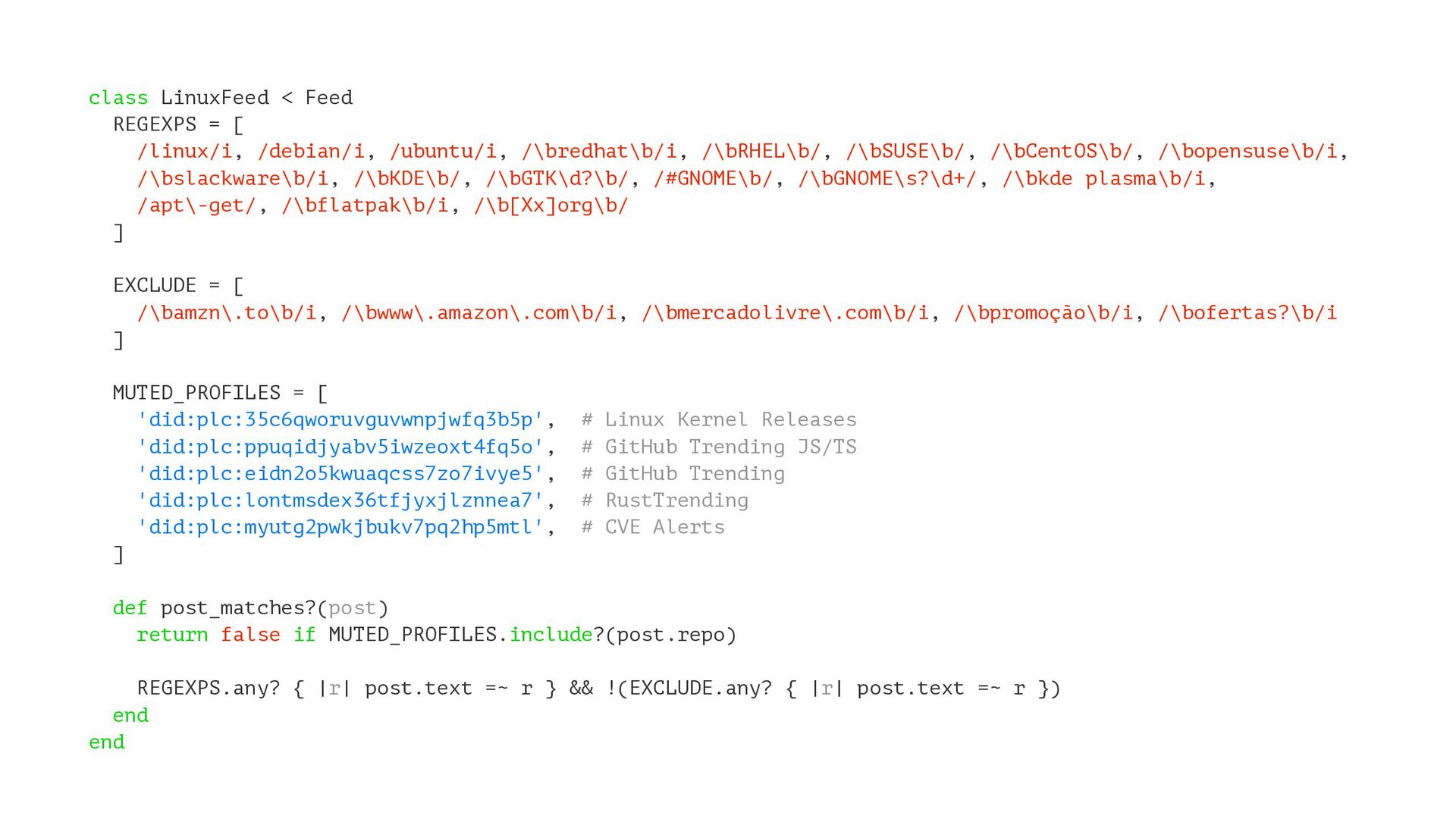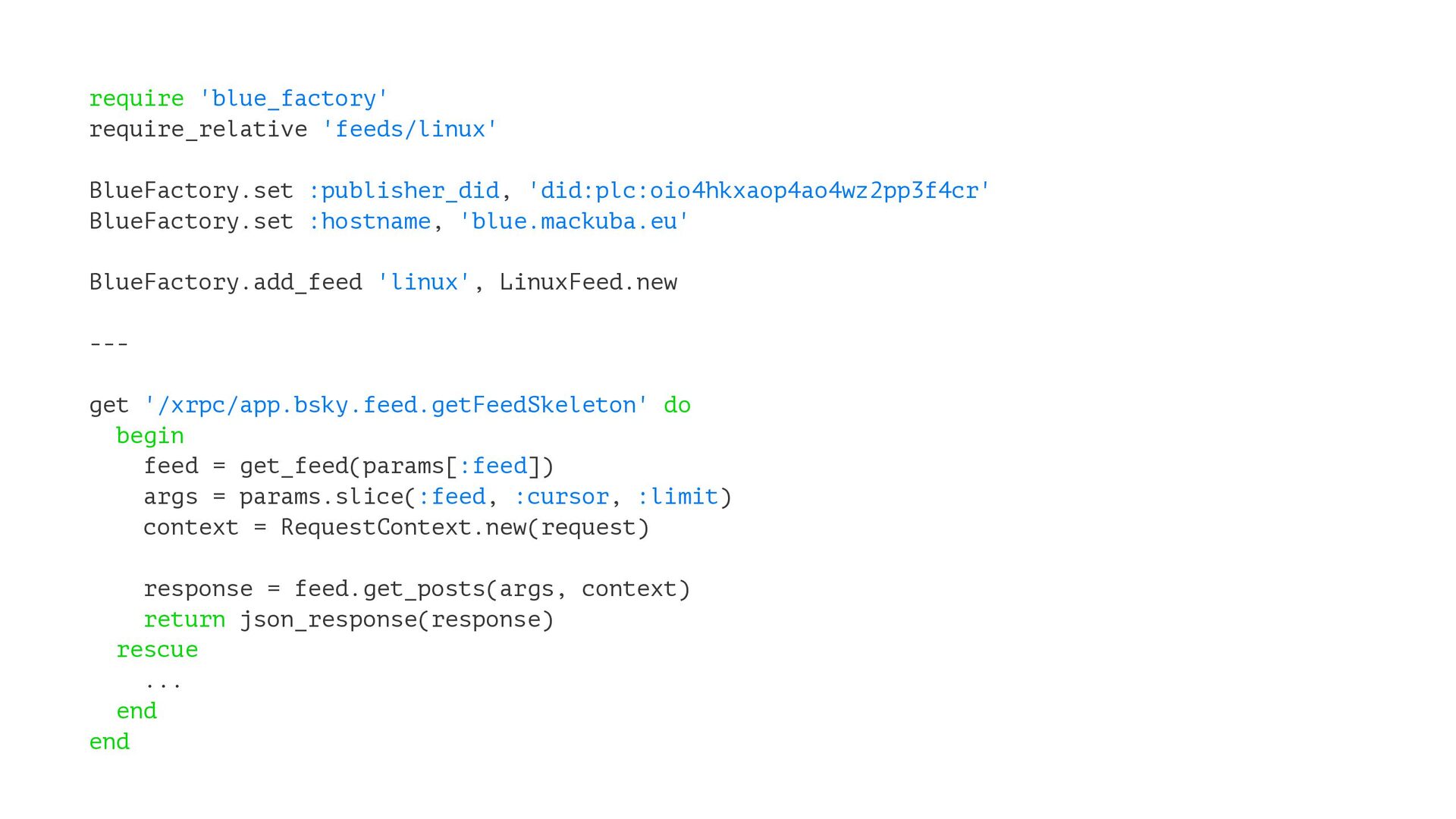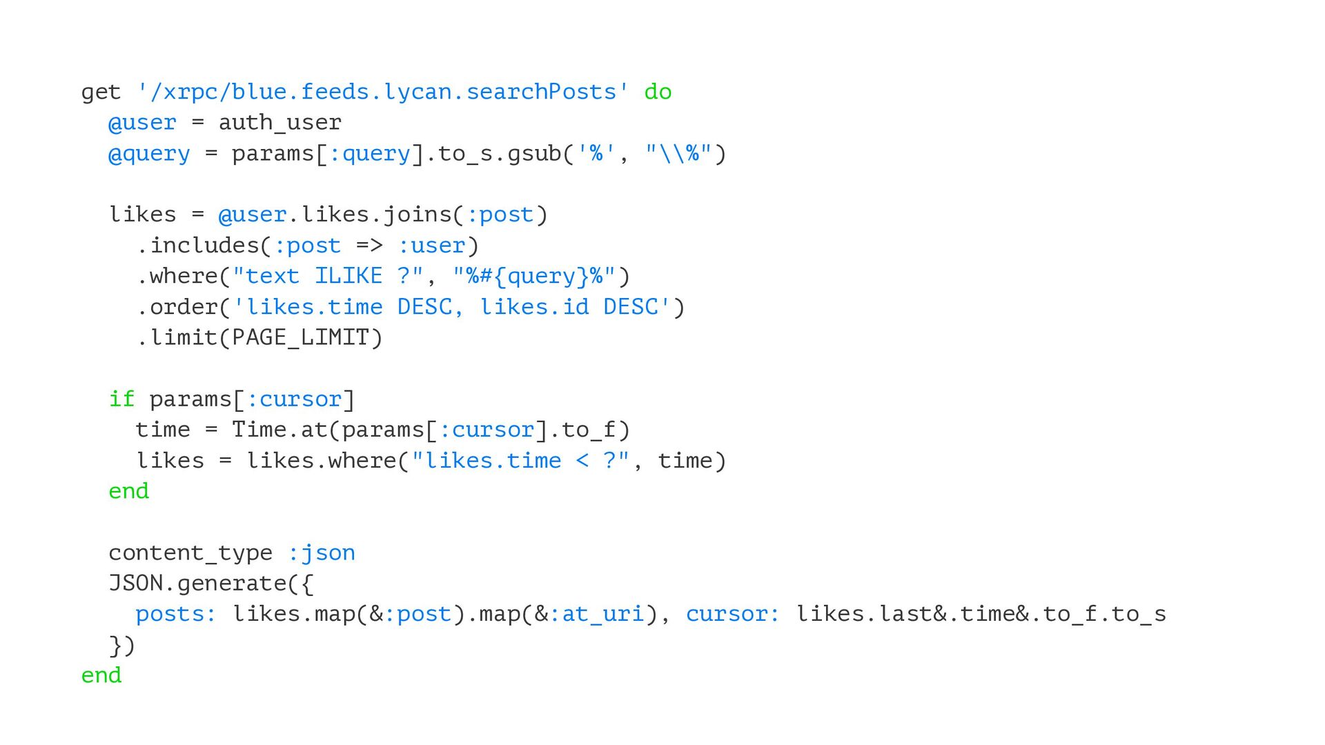 :commit msg.operations.each do |op| if op.action == :create && op.collection == 'app.bsky.feed.post' post = Post.create!(...) @feeds.each do |feed| if feed.post_matches?(post) post.feed_posts.create!(feed_id: feed.id, time: msg.time) end end end end end