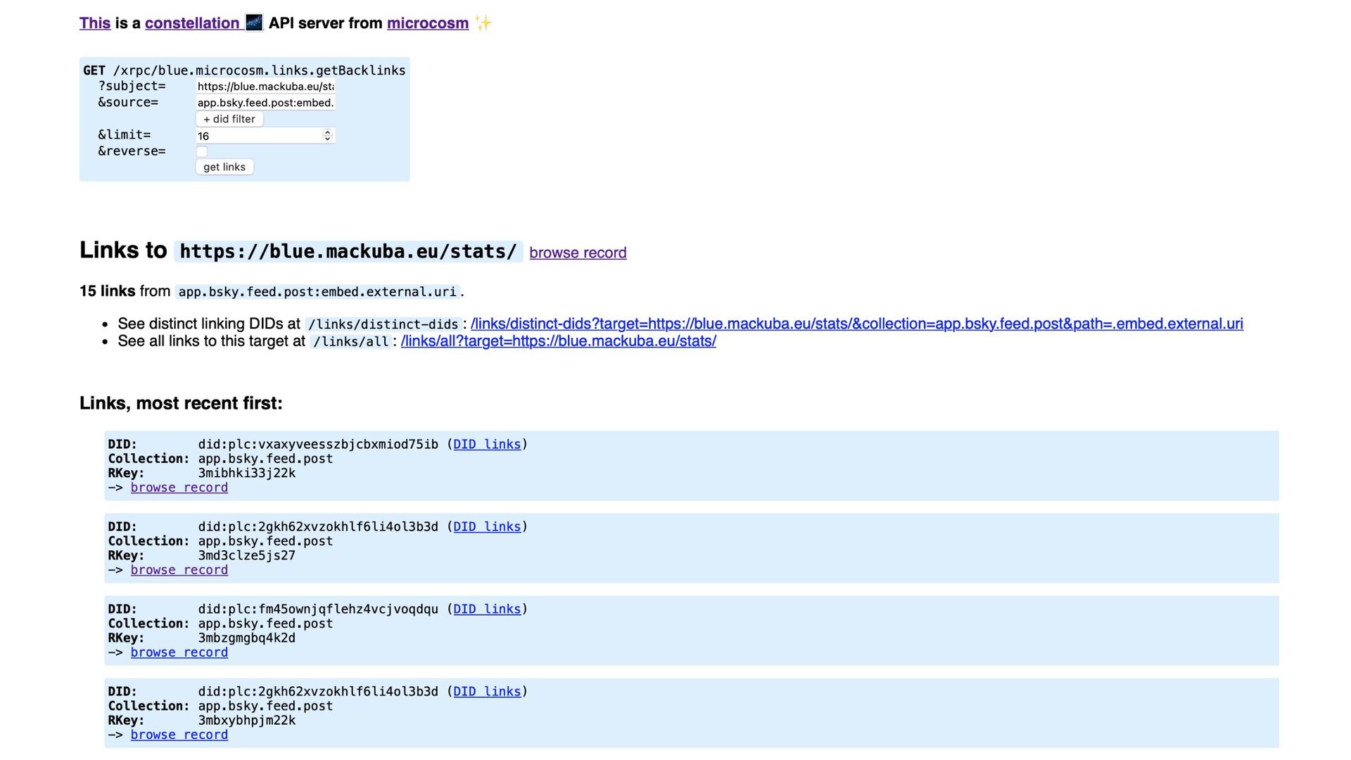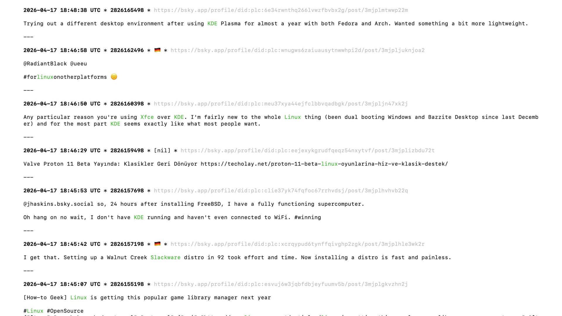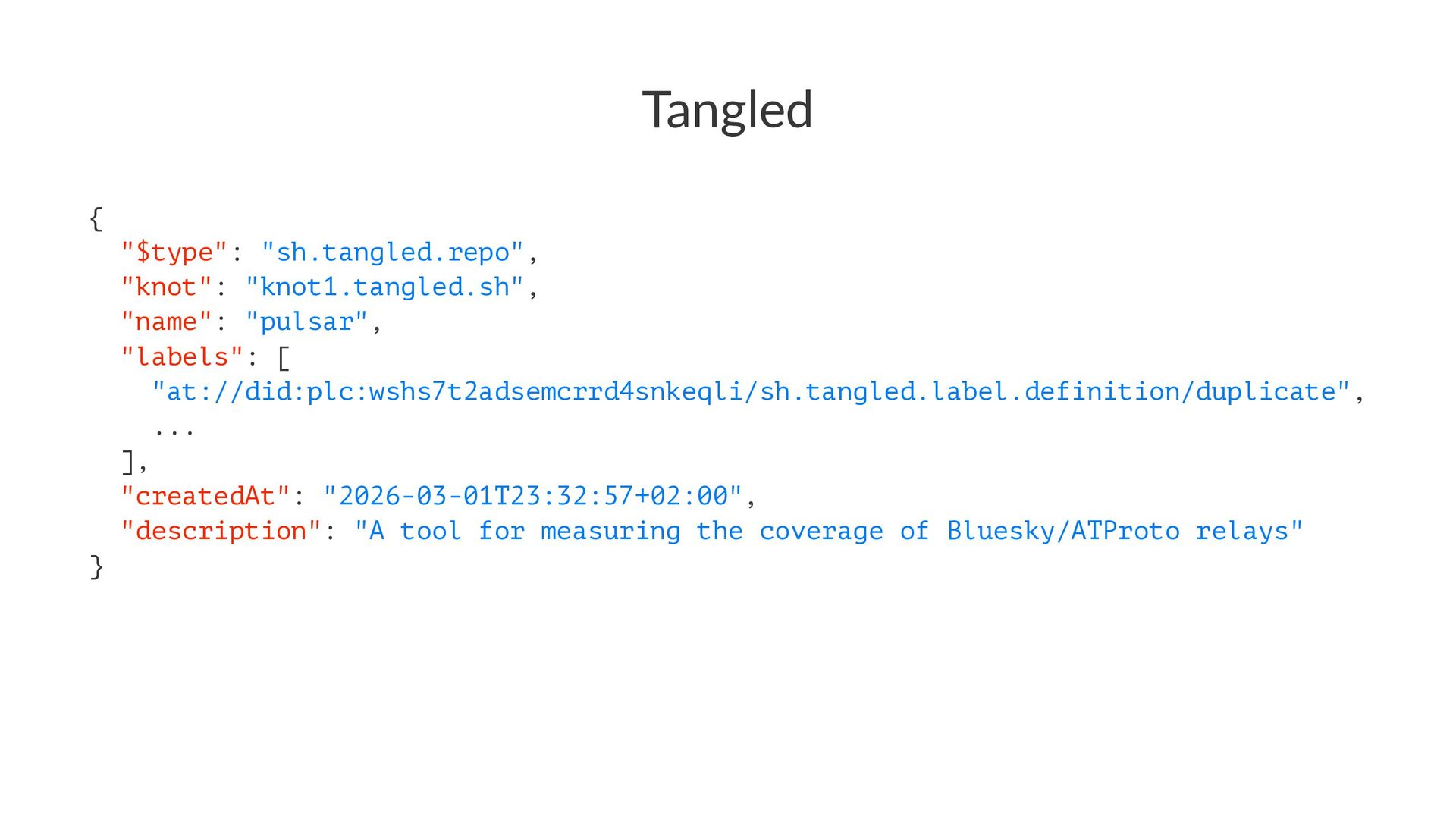 "at://did:plc:wshs7t2adsemcrrd4snkeqli/sh.tangled.label.definition/duplicate", ... ], "createdAt": "2026-03-01T23:32:57+02:00", "description": "A tool for measuring the coverage of Bluesky/ATProto relays" }