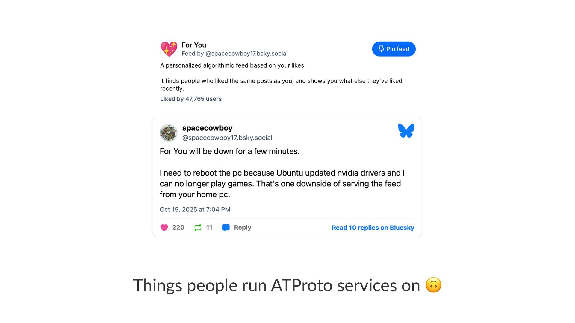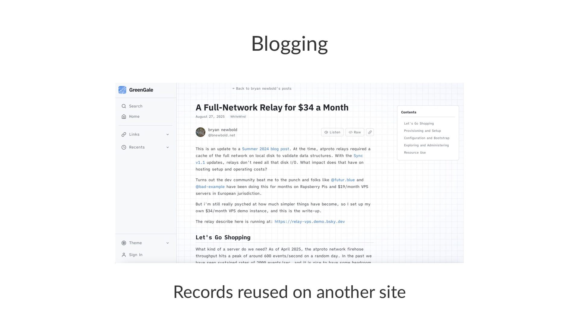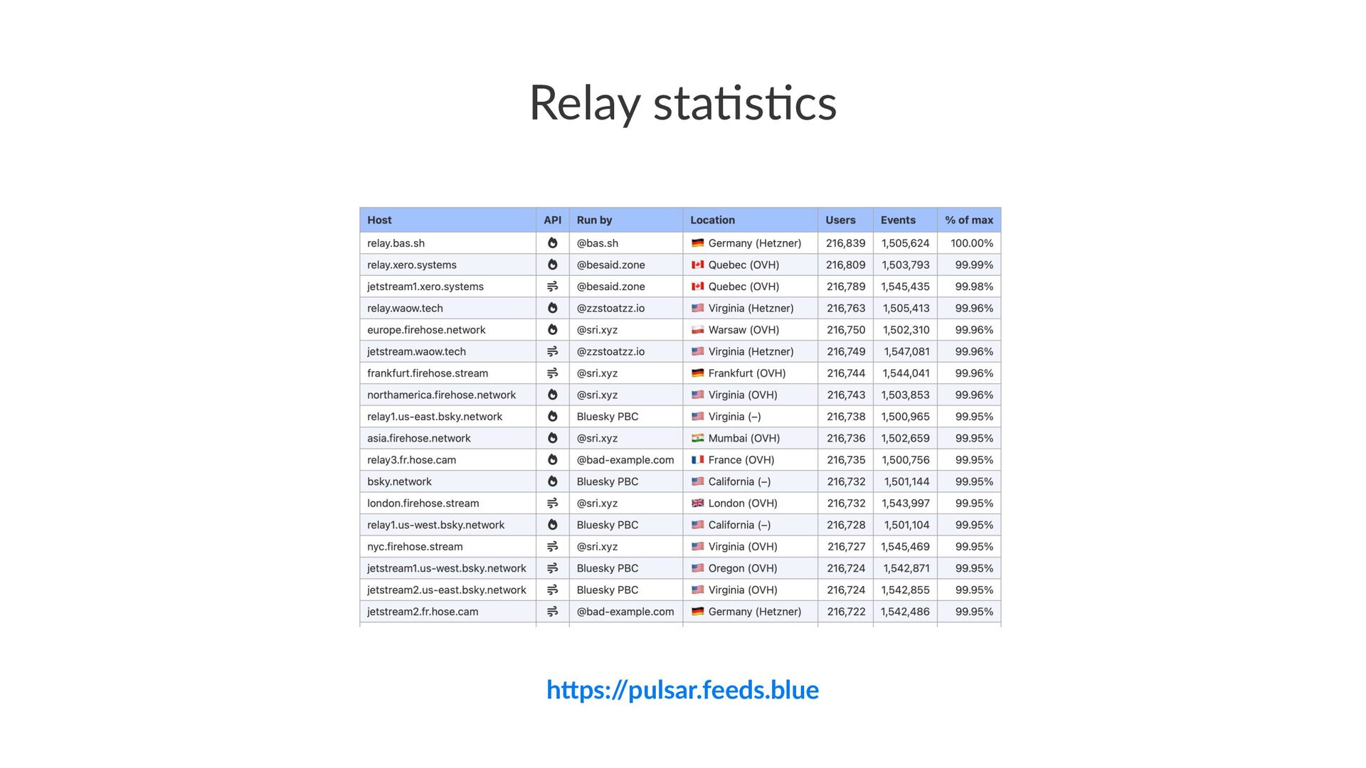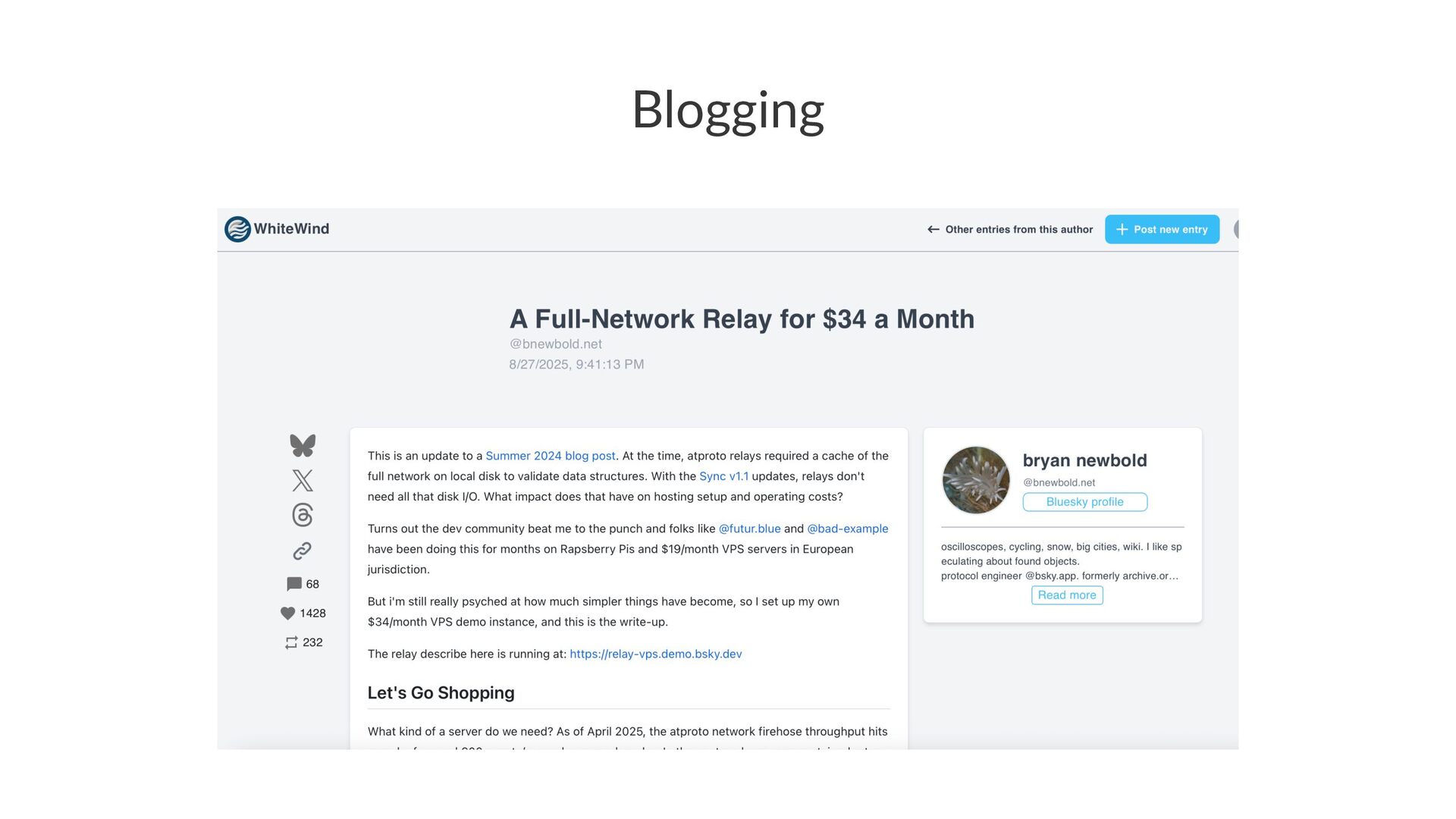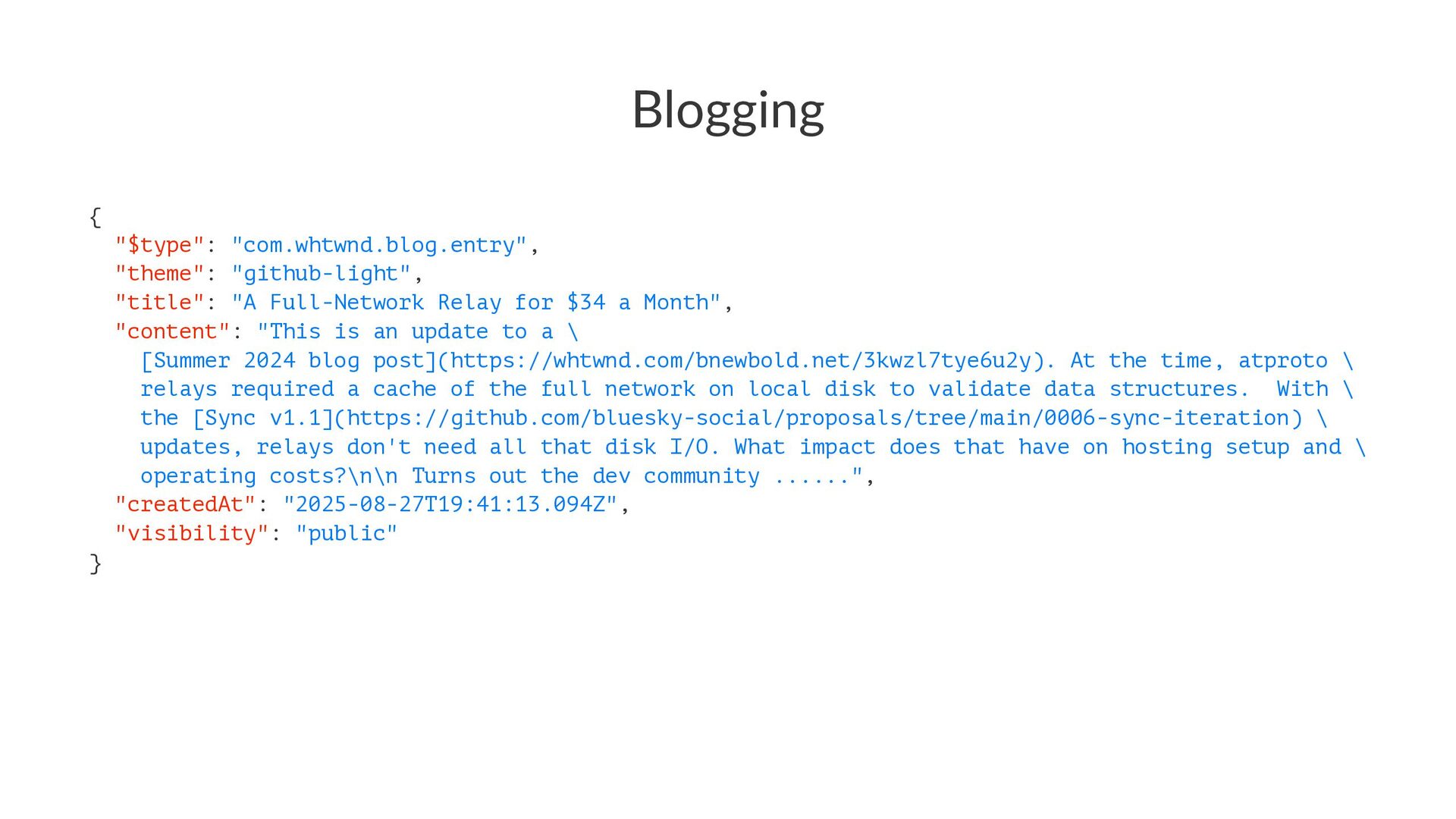 for $34 a Month", "content": "This is an update to a \ [Summer 2024 blog post](https://whtwnd.com/bnewbold.net/3kwzl7tye6u2y). At the time, atproto \ relays required a cache of the full network on local disk to validate data structures. With \ the [Sync v1.1](https://github.com/bluesky-social/proposals/tree/main/0006-sync-iteration) \ updates, relays don't need all that disk I/O. What impact does that have on hosting setup and \ operating costs?\n\n Turns out the dev community ......", "createdAt": "2025-08-27T19:41:13.094Z", "visibility": "public" }