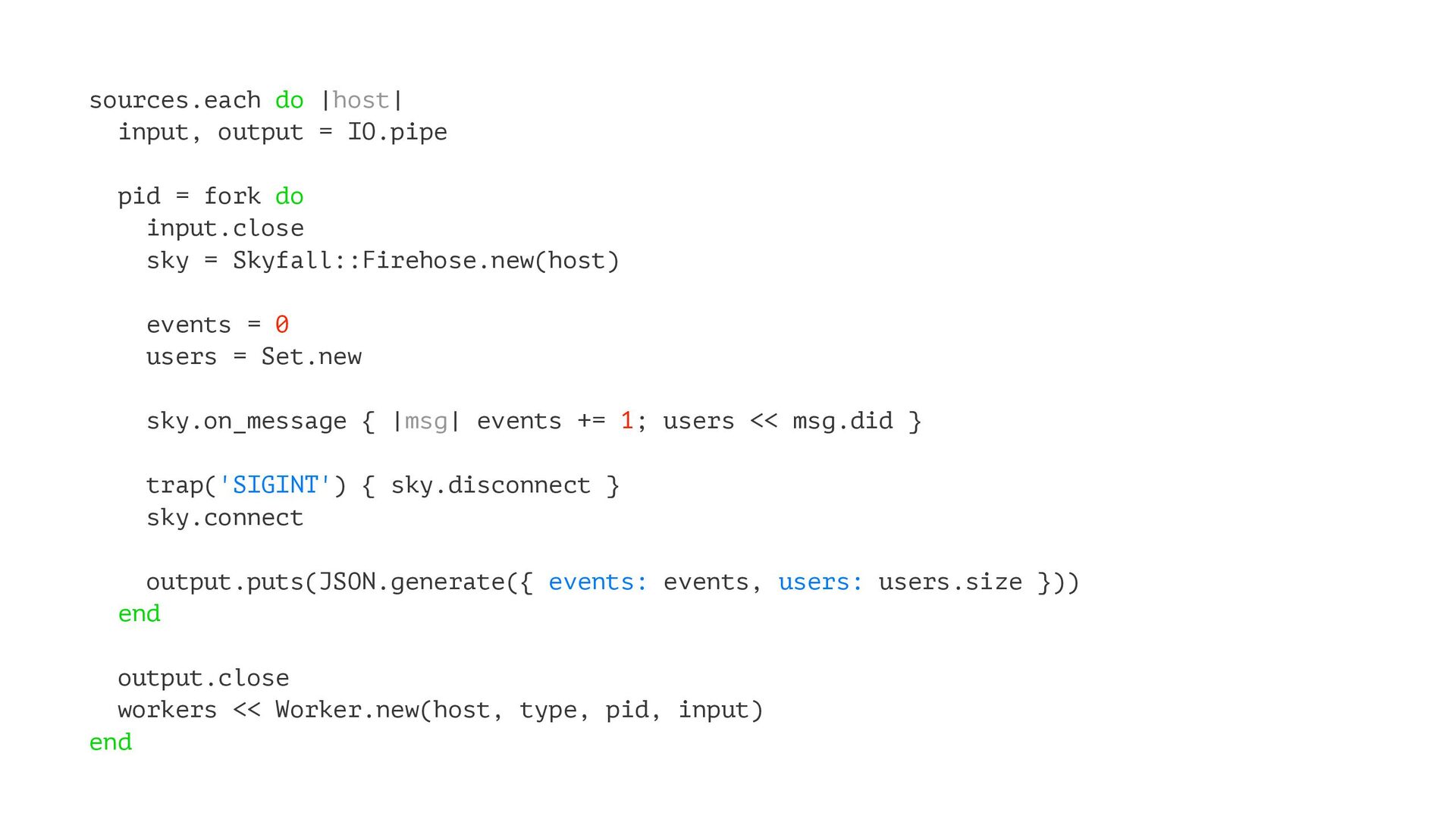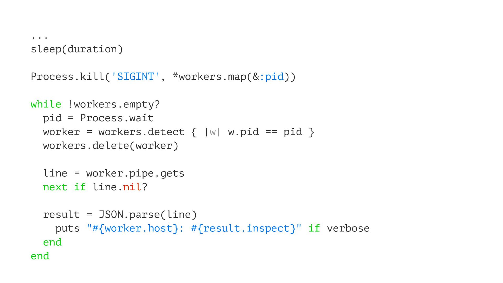 = workers.detect { |w| w.pid == pid } workers.delete(worker) line = worker.pipe.gets next if line.nil? result = JSON.parse(line) puts "#{worker.host}: #{result.inspect}" if verbose end end