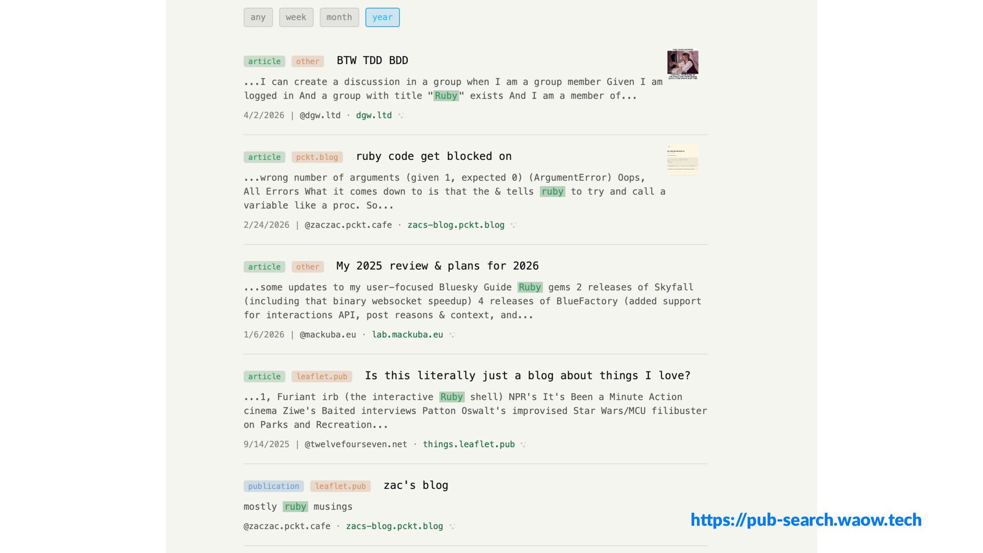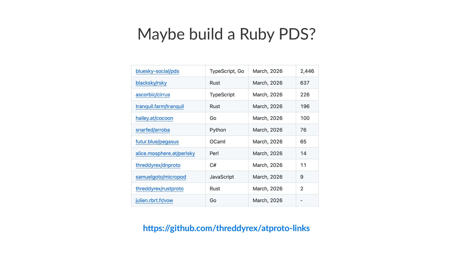 Overview of the architecture of the AT Protocol network, some examples of the projects I've built on it with Ruby, and a showcase of some other people's projects