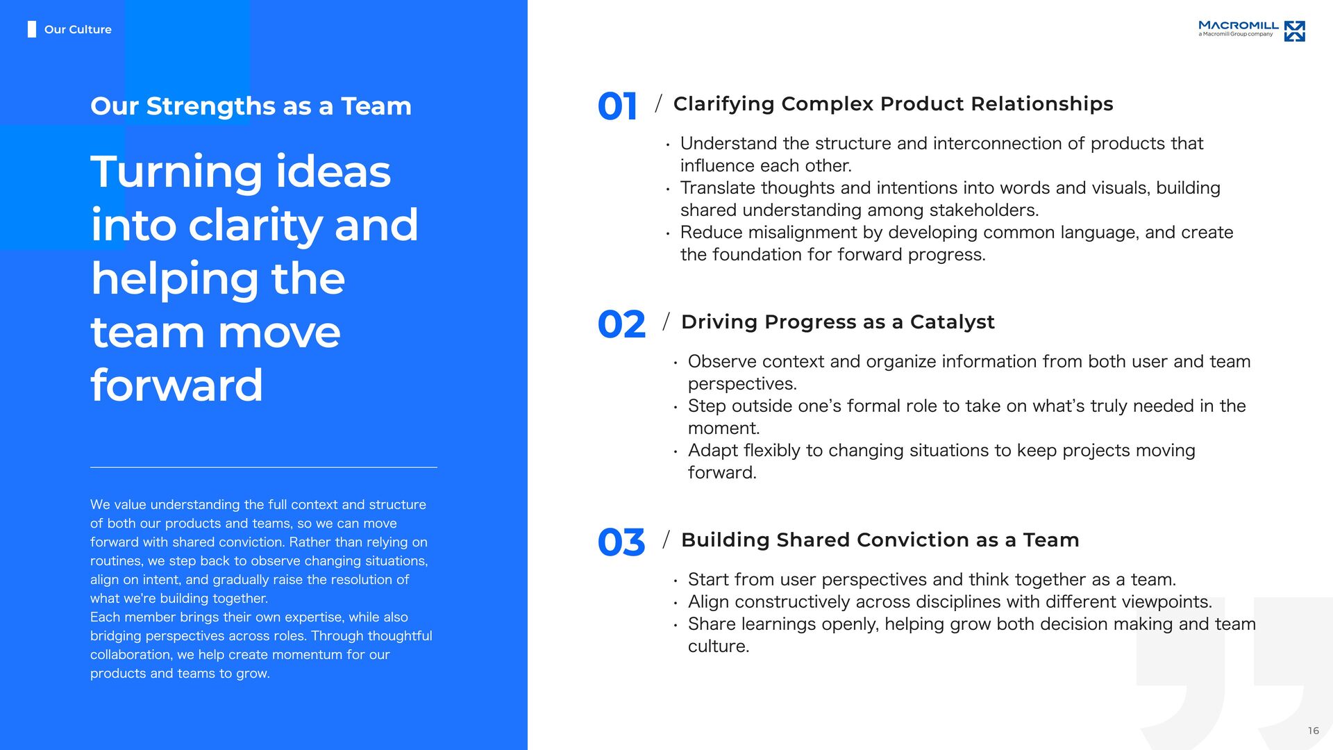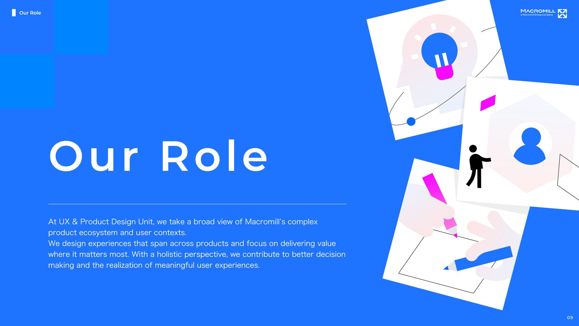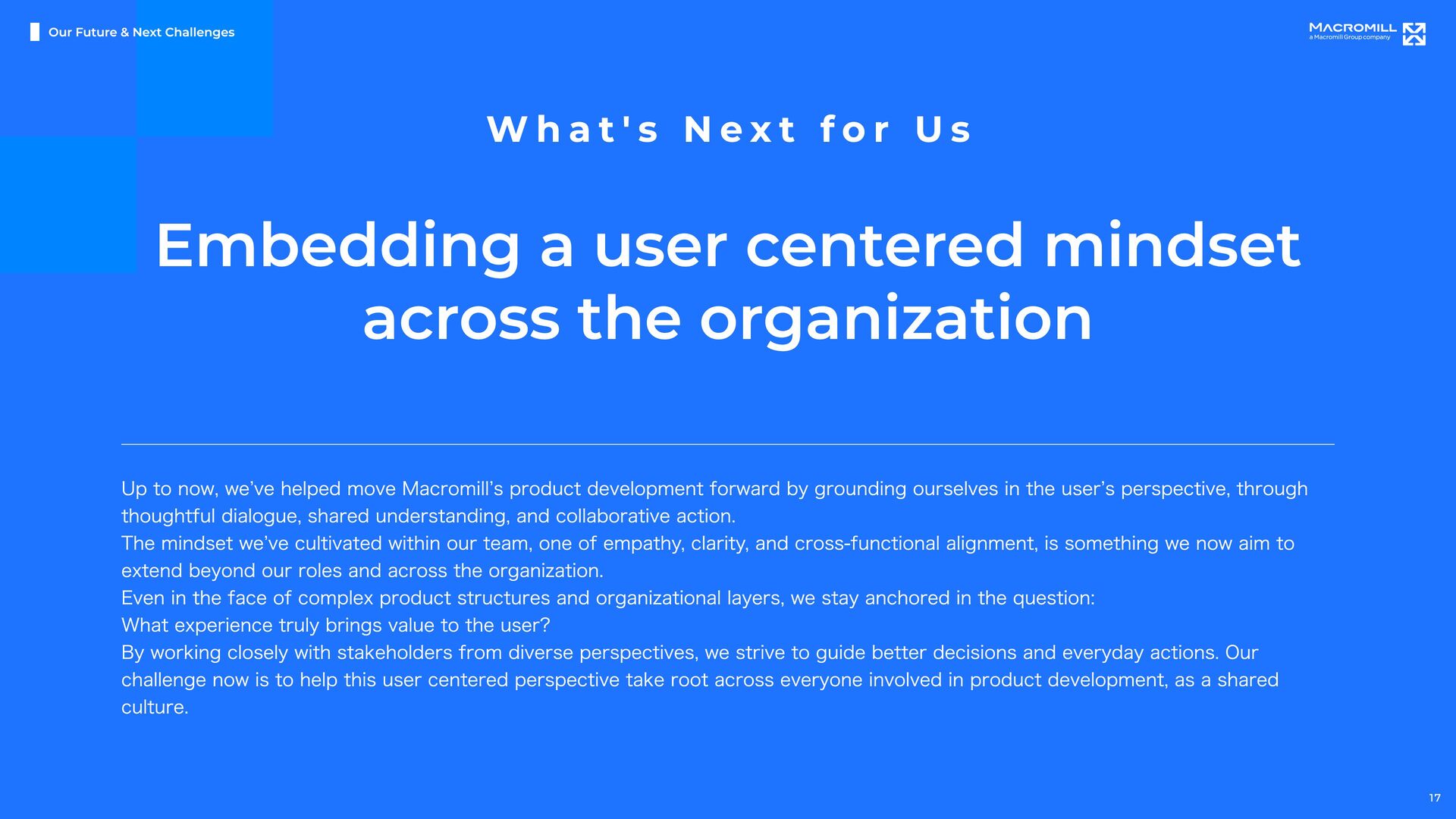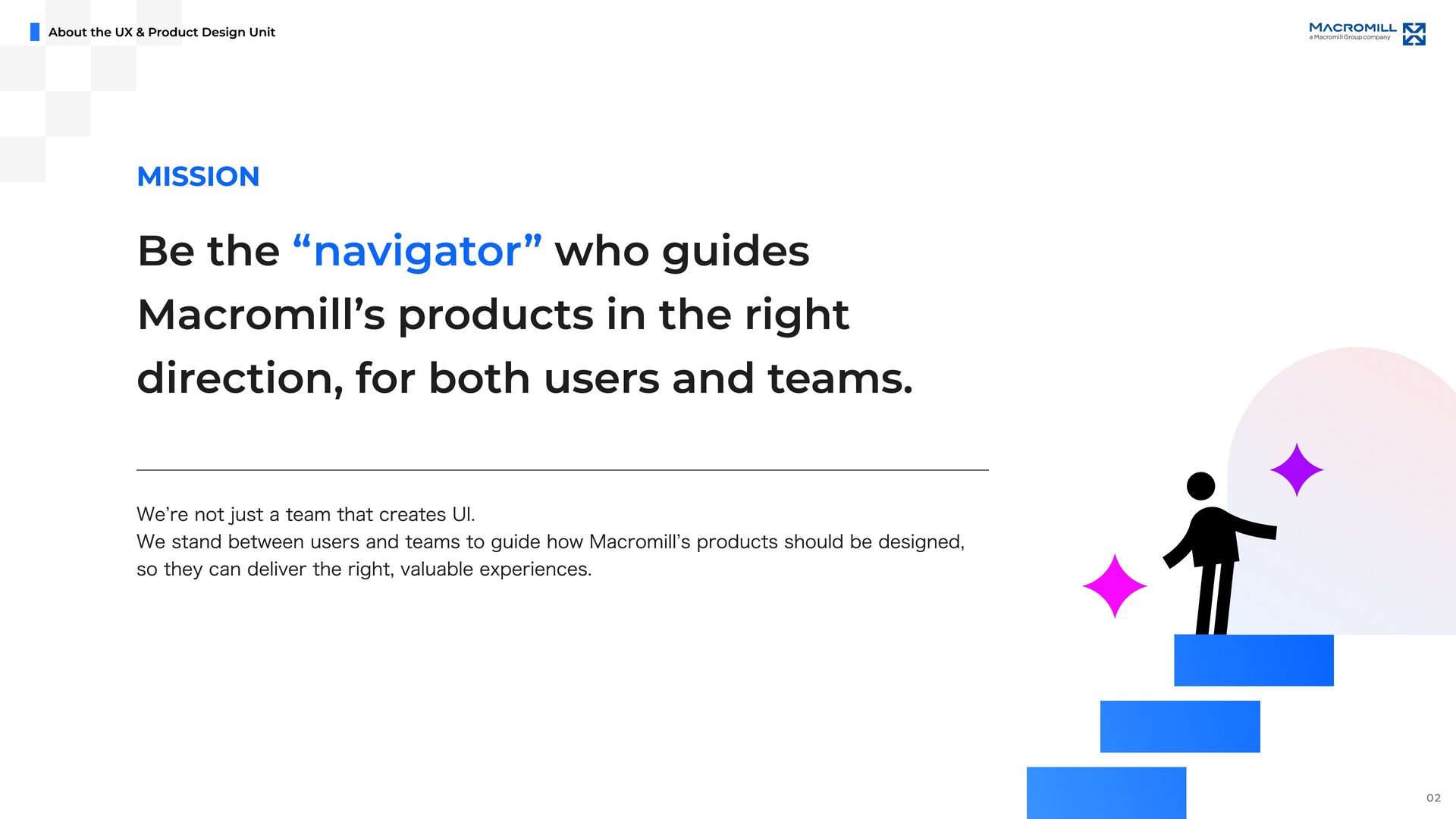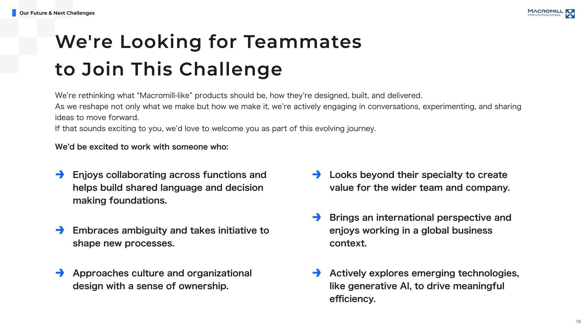 e e l D r a w n t o T h i s C h a l l e n g e M a c r o m i l l ˇ s U X & P r o d u c t D e s i g n U n i t i s i n a p i v o t a l m o m e n t o f g r o w t h , a s w e t r a n s i t i o n i n t o a f u l l y i n - h o u s e d e s i g n o r g a n i z a t i o n . I t ˇ s a t i m e o f c h a n g e , f u l l o f o p p o r t u n i t i e s t o t a k e o w n e r s h i p a n d s h a p e n e w w a y s o f w o r k i n g b e y o n d t r a d i t i o n a l s t r u c t u r e s . O u r t e a m i s d e f i n e d b y a n o p e n , t r a n s p a r e n t c u l t u r e a n d t h e e a s e o f c o l l a b o r a t i o n a c r o s s r o l e s a n d t i t l e s . ( W e w o r k c l o s e l y a n d r e s p e c t f u l l y w i t h m e m b e r s a c r o s s J a p a n a n d a b r o a d , e n g a g i n g i n d i a l o g u e a n d c o - c r e a t i o n t o d e l i v e r b e t t e r o u t c o m e s . W e a i m t o b e d e s i g n e r s w h o t a k e f u l l r e s p o n s i b i l i t y f o r t h e u s e r e x p e r i e n c e , w h i l e a l s o s h a p i n g h o w p r o d u c t s a r e b u i l t a n d h o w t e a m s w o r k . W e ˇ r e n o t j u s t c r e a t i n g U I , w e ˇ r e w o r k i n g t o m o v e t h e p r o d u c t a n d t h e o r g a n i z a t i o n f o r w a r d , t o g e t h e r . I f y o u ˇ r e e x c i t e d t o g r o w t h r o u g h h a n d s o n p r a c t i c e , w h e t h e r i n c o m m u n i c a t i o n , l e a d e r s h i p , c o l l a b o r a t i o n , o r d e s i g n e x e c u t i o n , a n d w a n t t o b r i n g a g l o b a l p e r s p e c t i v e t o m e a n i n g f u l c h a l l e n g e s , w e ˇ d l o v e t o w o r k w i t h y o u . Our Fu ture & Nex t Ch alle nge s 19
