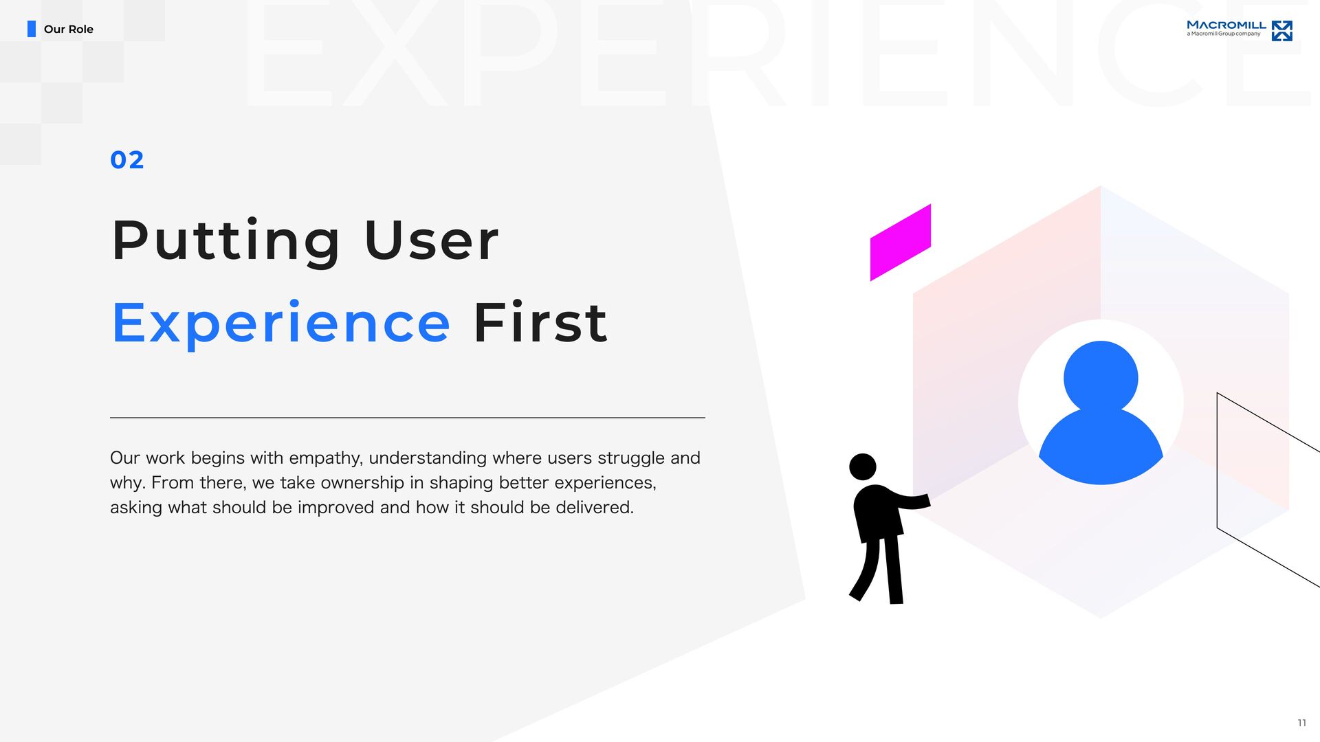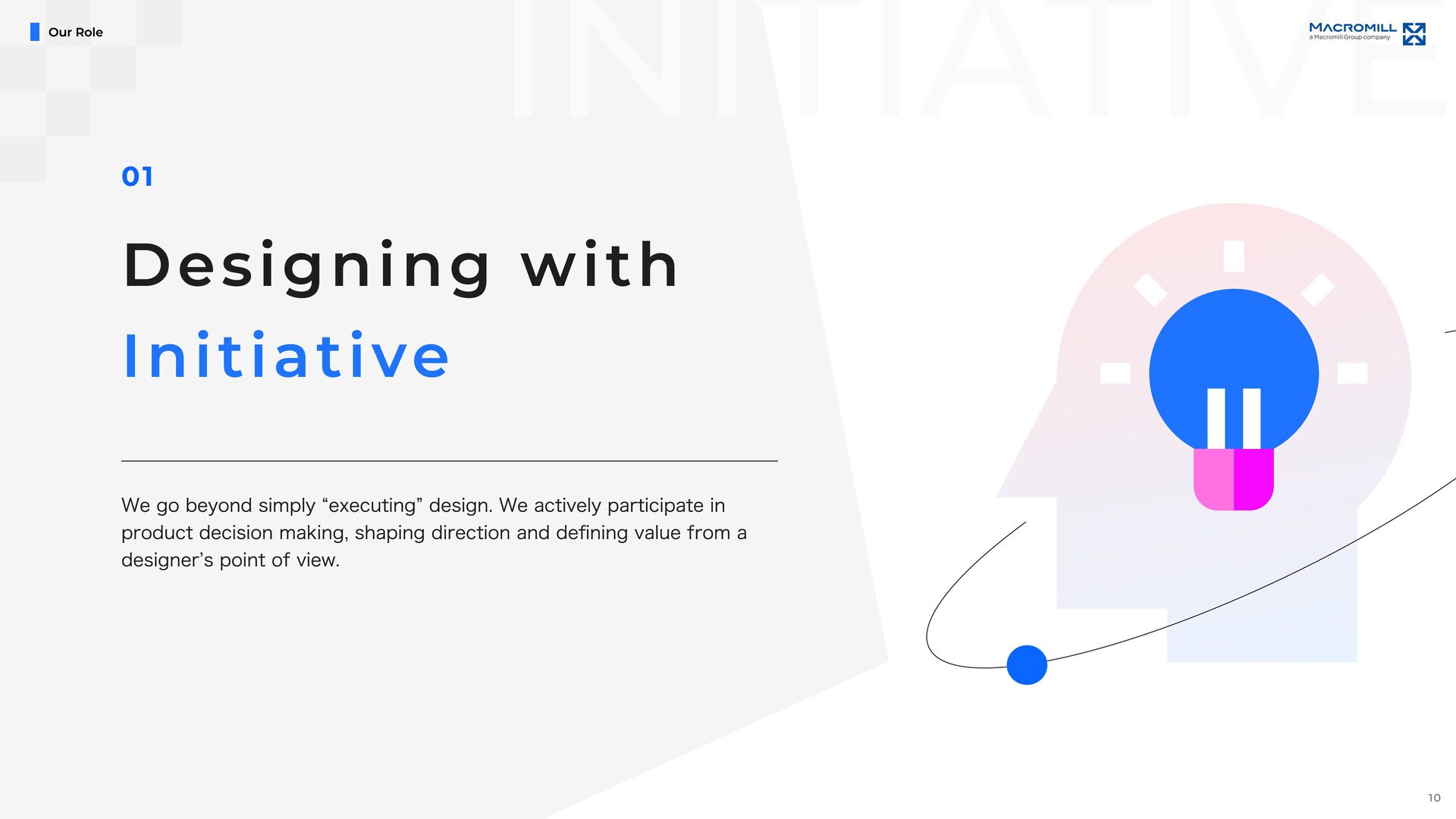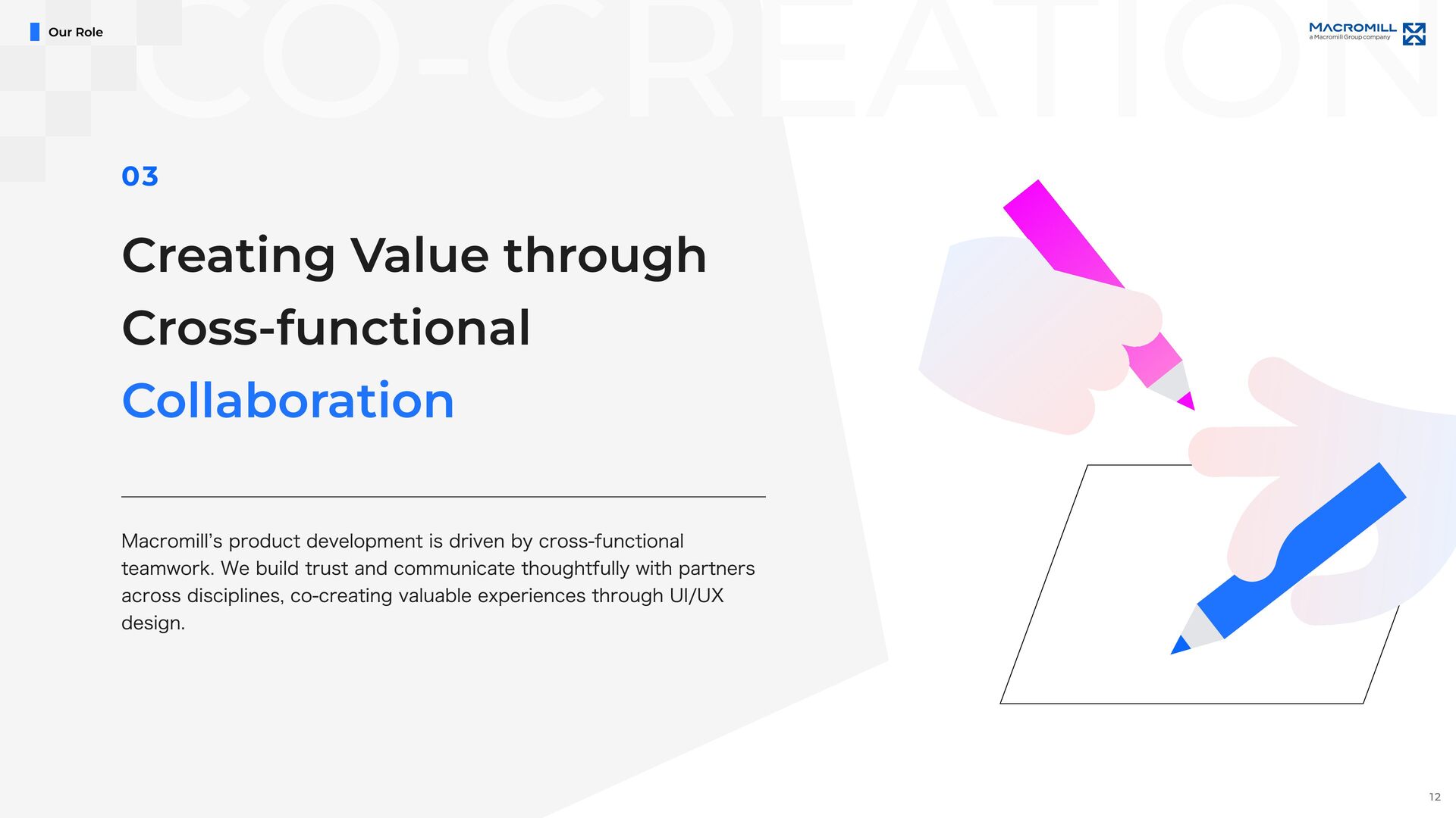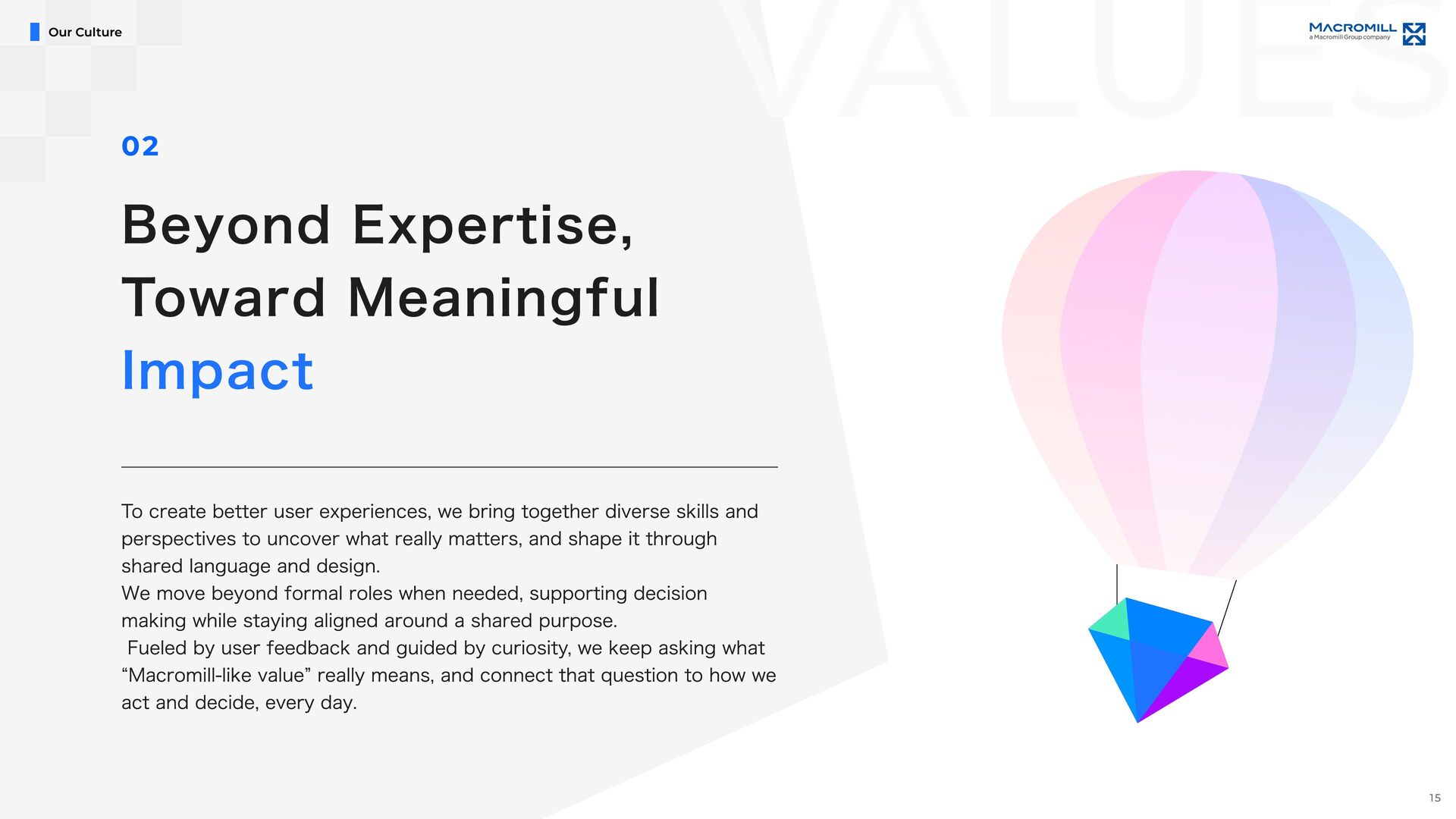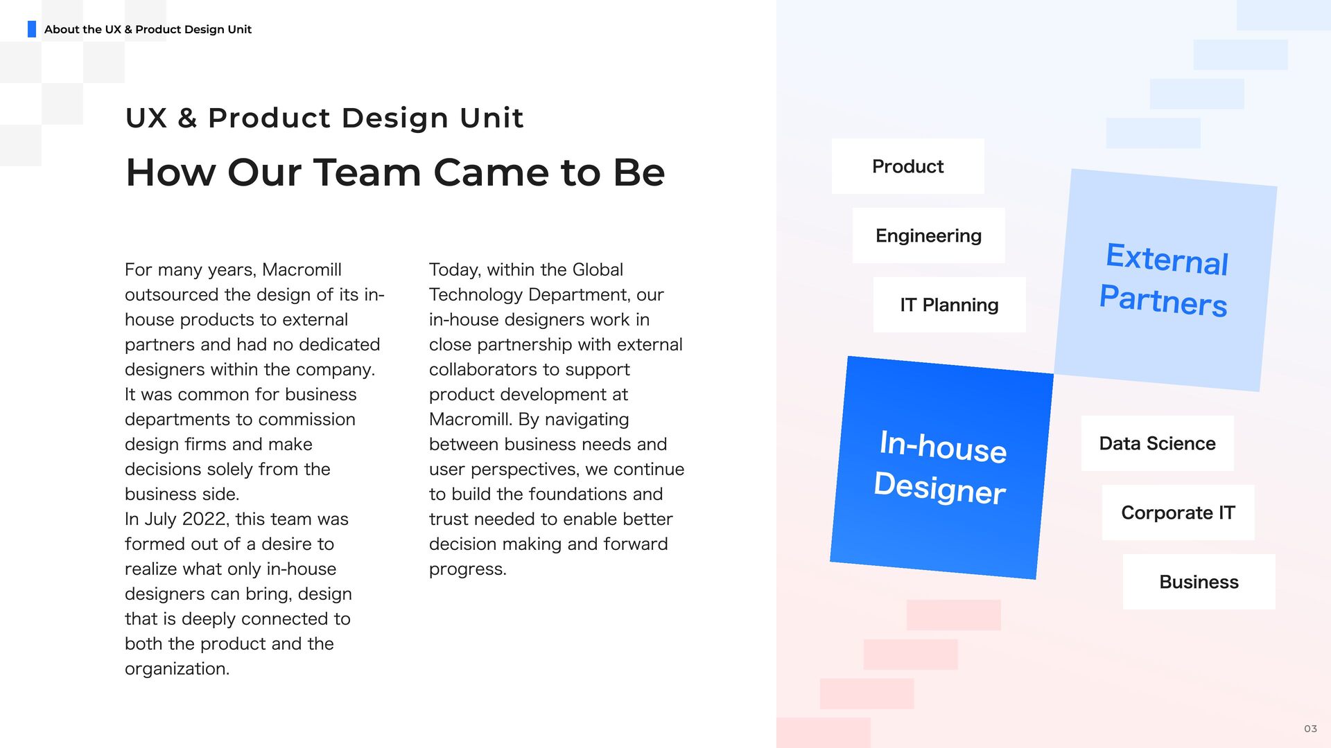 e e l D r a w n t o T h i s C h a l l e n g e M a c r o m i l l ˇ s U X & P r o d u c t D e s i g n U n i t i s i n a p i v o t a l m o m e n t o f g r o w t h , a s w e t r a n s i t i o n i n t o a f u l l y i n - h o u s e d e s i g n o r g a n i z a t i o n . I t ˇ s a t i m e o f c h a n g e , f u l l o f o p p o r t u n i t i e s t o t a k e o w n e r s h i p a n d s h a p e n e w w a y s o f w o r k i n g b e y o n d t r a d i t i o n a l s t r u c t u r e s . O u r t e a m i s d e f i n e d b y a n o p e n , t r a n s p a r e n t c u l t u r e a n d t h e e a s e o f c o l l a b o r a t i o n a c r o s s r o l e s a n d t i t l e s . ( W e w o r k c l o s e l y a n d r e s p e c t f u l l y w i t h m e m b e r s a c r o s s J a p a n a n d a b r o a d , e n g a g i n g i n d i a l o g u e a n d c o - c r e a t i o n t o d e l i v e r b e t t e r o u t c o m e s . W e a i m t o b e d e s i g n e r s w h o t a k e f u l l r e s p o n s i b i l i t y f o r t h e u s e r e x p e r i e n c e , w h i l e a l s o s h a p i n g h o w p r o d u c t s a r e b u i l t a n d h o w t e a m s w o r k . W e ˇ r e n o t j u s t c r e a t i n g U I , w e ˇ r e w o r k i n g t o m o v e t h e p r o d u c t a n d t h e o r g a n i z a t i o n f o r w a r d , t o g e t h e r . I f y o u ˇ r e e x c i t e d t o g r o w t h r o u g h h a n d s o n p r a c t i c e , w h e t h e r i n c o m m u n i c a t i o n , l e a d e r s h i p , c o l l a b o r a t i o n , o r d e s i g n e x e c u t i o n , a n d w a n t t o b r i n g a g l o b a l p e r s p e c t i v e t o m e a n i n g f u l c h a l l e n g e s , w e ˇ d l o v e t o w o r k w i t h y o u . Our Fu ture & Nex t Ch alle nge s 19