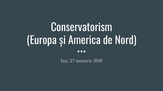 • Scepticism fa ță de schimb ă rile radicale; • Valoarea institu ț iilor tradi ț ionale (familie, na ț iune, constitutie, religie, armata, banca central ă , etc.); • Schimbare organic ă ; rolul comunit ăț ii; • Drepturi civile ș i politice; proprietate privat ă ; • Nu este reac ț ionar, nici revolu ț ionar; • Contradic ț ii fa ță de liberalism, socialism, na ț ionalism, comunism, fascism, etc.; • Libertatea individual ă nu este absolut ă ; • Limitele guvernului - protejarea libert ăț ilor ș i a drepturilor; • Stabilitate, securitate, paternalism; • Opozi ț ie atât fa ță de tirania celor mul ț i, dar ș i fa ță de cei pu ț ini;. • Particularti ț ile locale ș i na ț ionale. Diferite ramifica ț ii (!nu sunt incompatibile): • Conservatorism social; • Conservatorism moral; • Conservatorism fiscal; • Neoconservatorism; • Conservatorism religios; • etc...