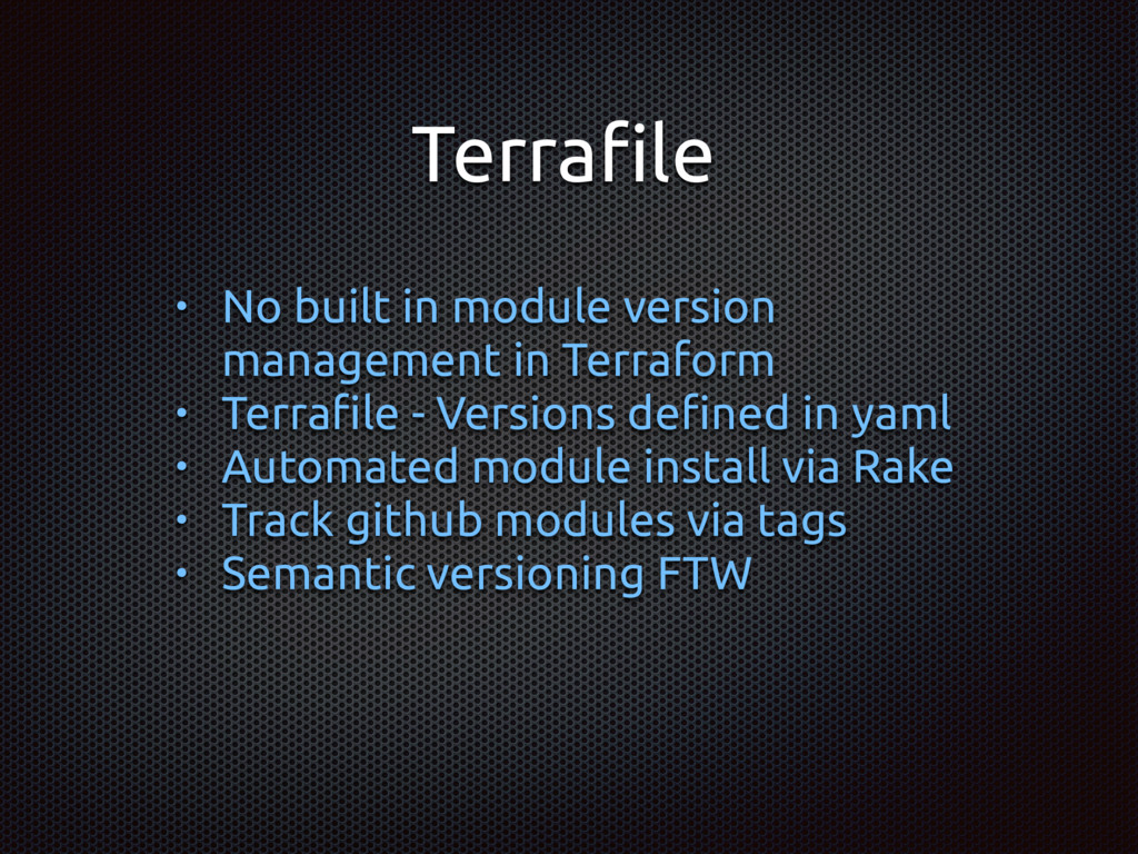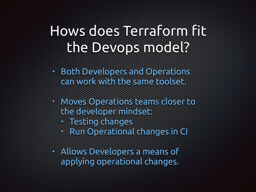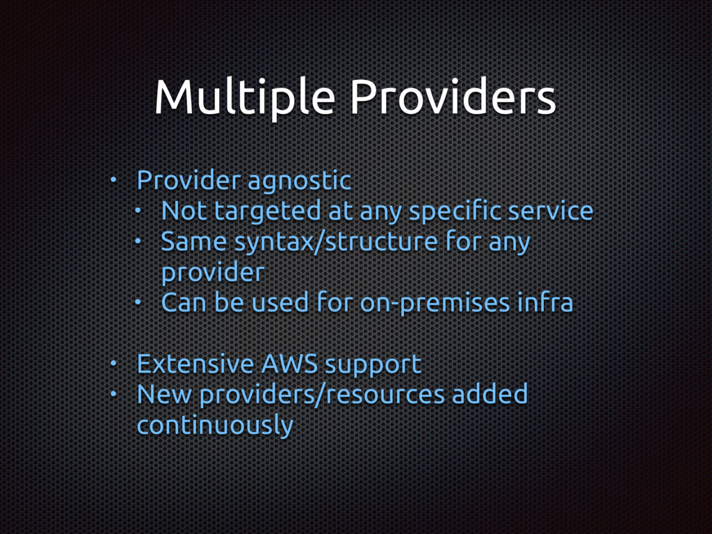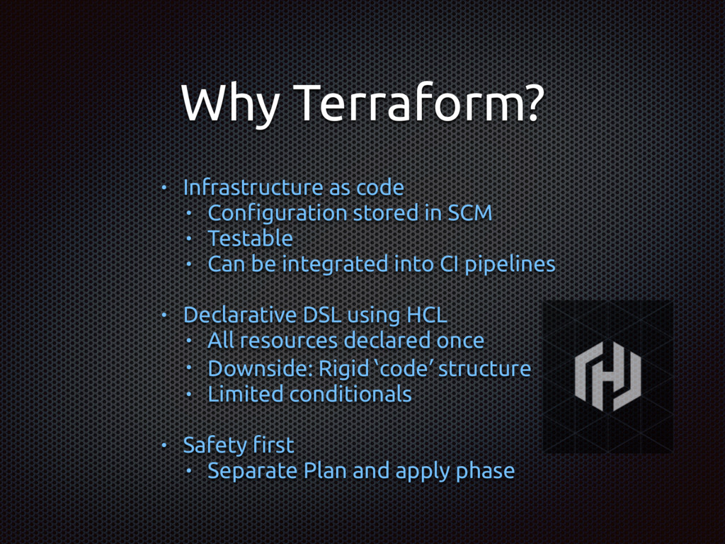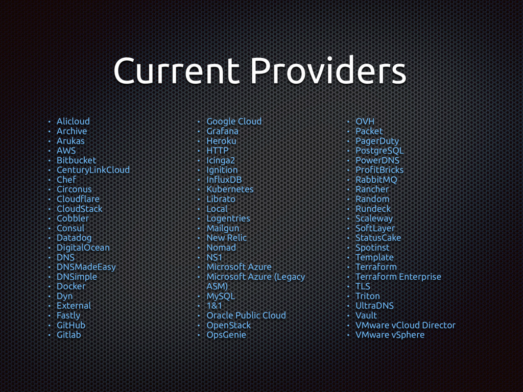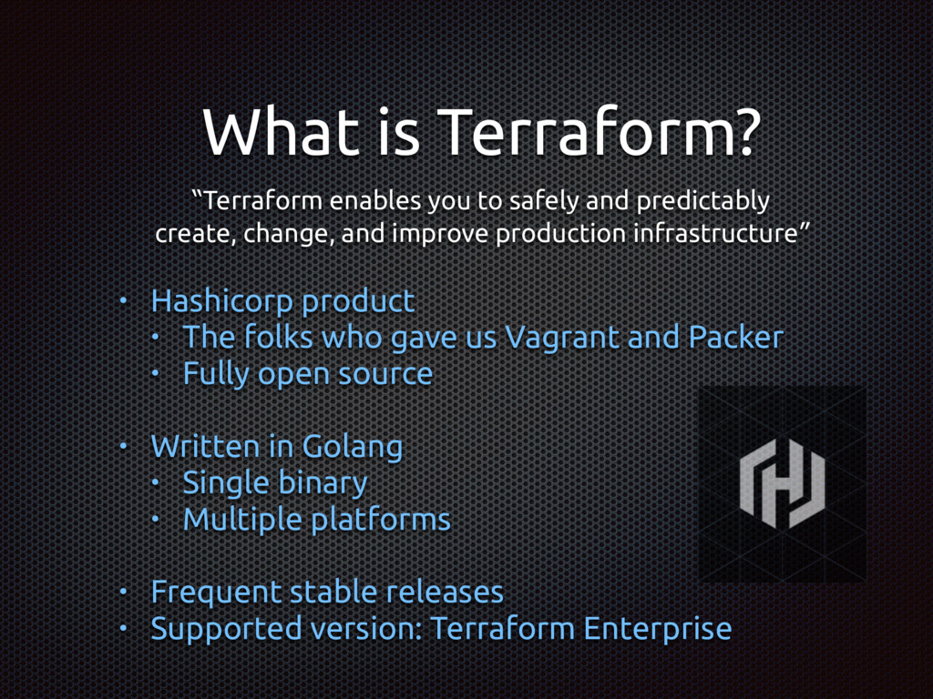 gave us Vagrant and Packer • Fully open source • Written in Golang • Single binary • Multiple platforms • Frequent stable releases • Supported version: Terraform Enterprise “Terraform enables you to safely and predictably create, change, and improve production infrastructure”