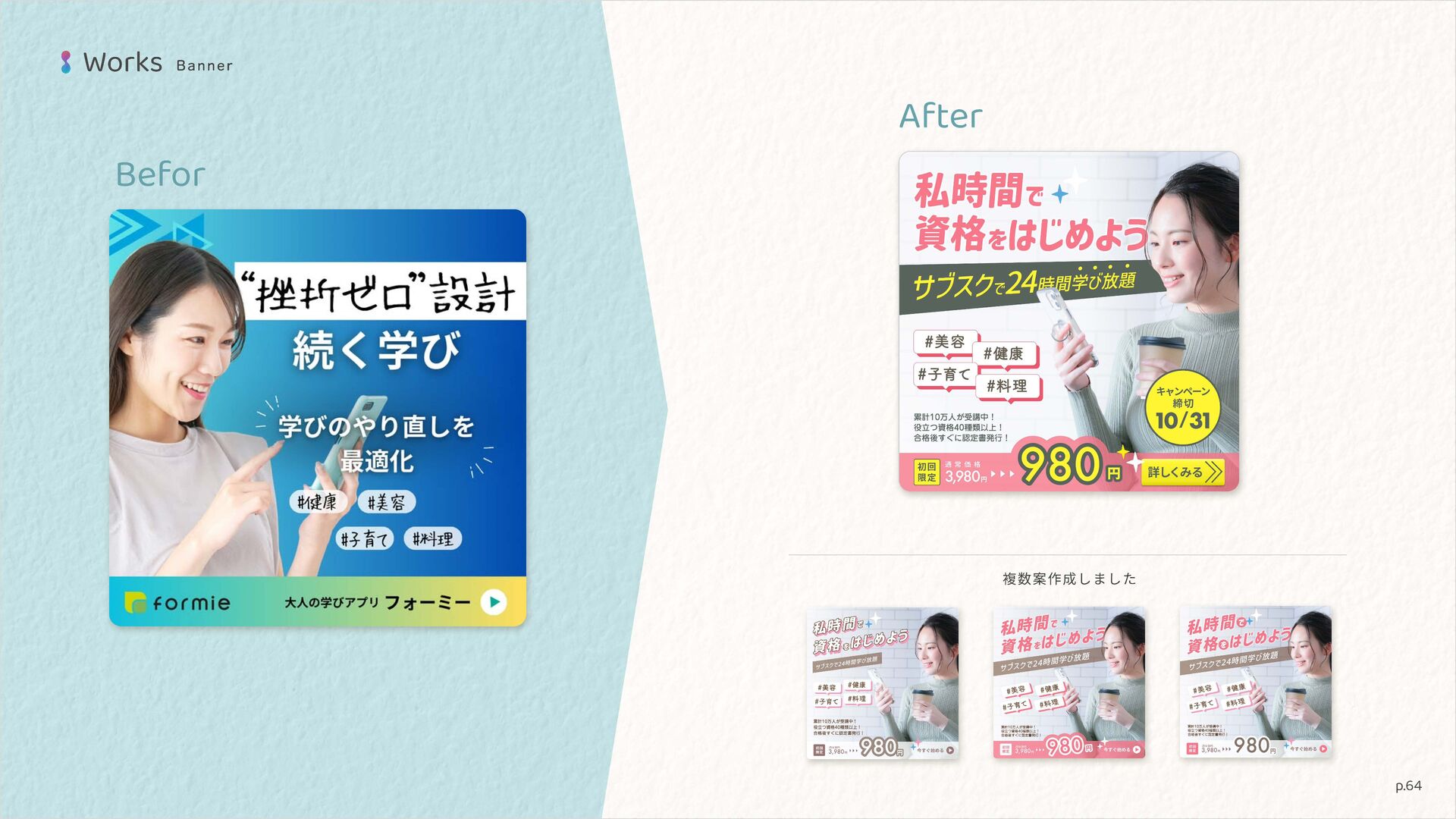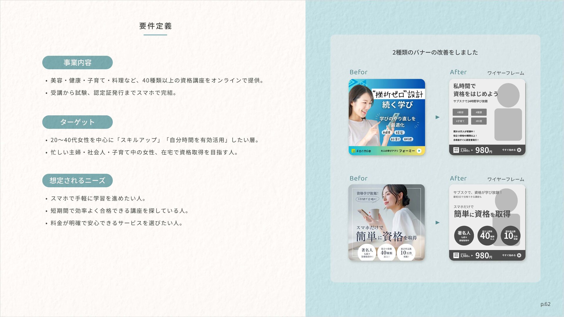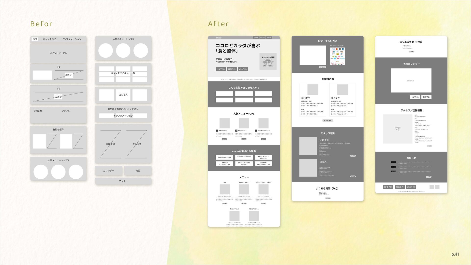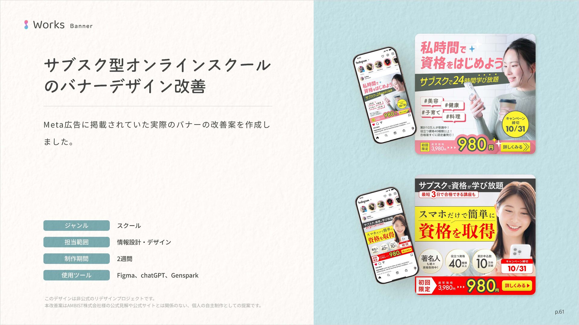 情報設計、ワイヤーフレーム、UI(アプリ)デザイン、Webデザイン、LP制作、バナーなど、 企画からデザインまでを掲載しています。
