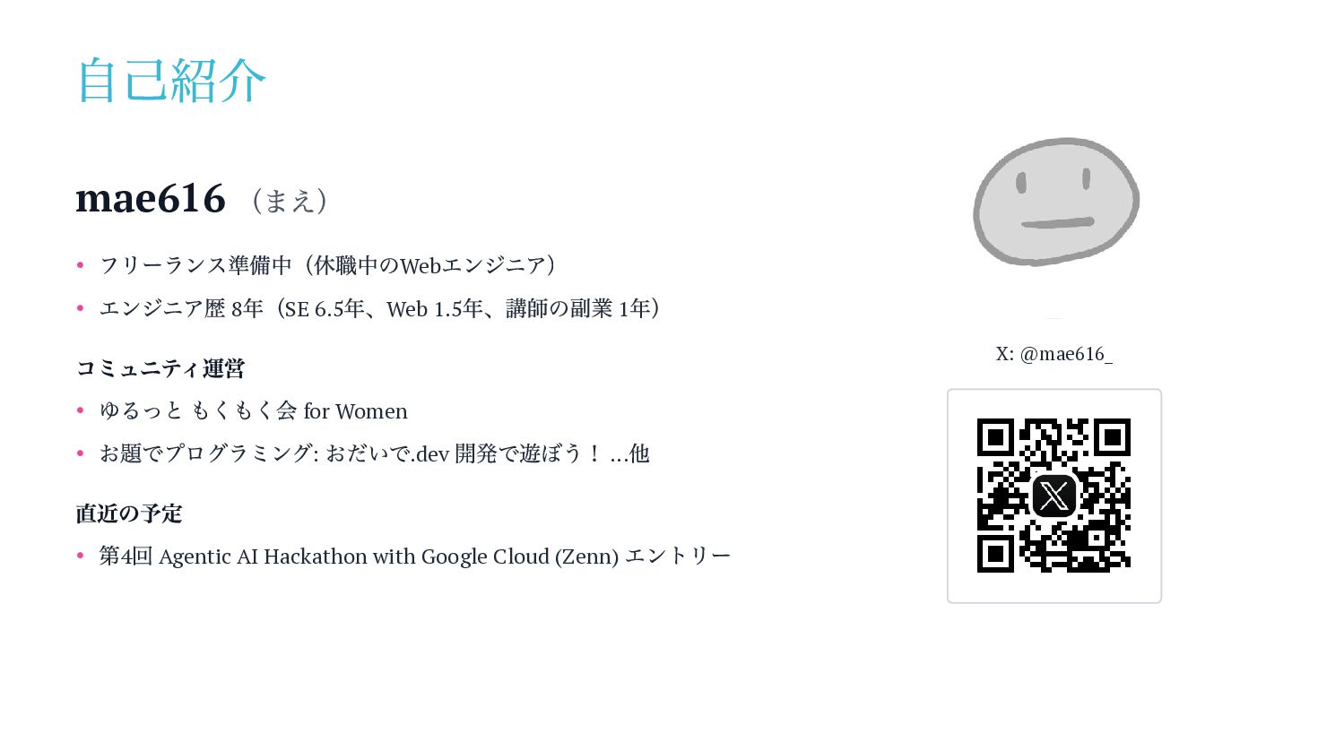 6.5 年、Web 1.5 年、講師の副業 1 年) コミュニティ運営 • ゆるっと もくもく会 for Women • お題でプログラミング: おだいで.dev 開発で遊ぼう! ... 他 直近の予定 • 第4 回 Agentic AI Hackathon with Google Cloud (Zenn) エントリー X: @mae616_