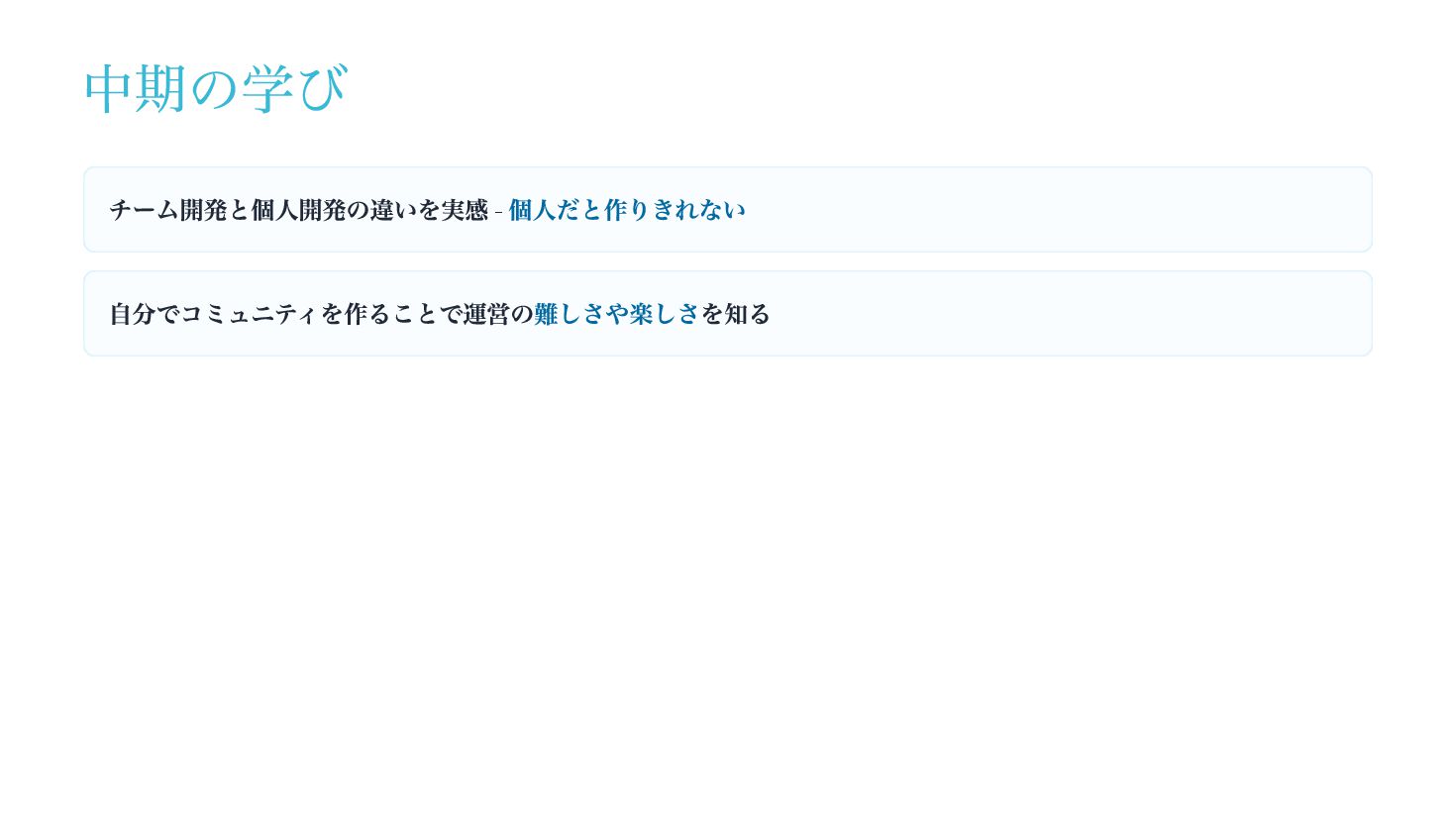 中期の学び チーム開発と個人開発の違いを実感 - 個人だと作りきれない 自分でコミュニティを作ることで運営の難しさや楽しさを知る