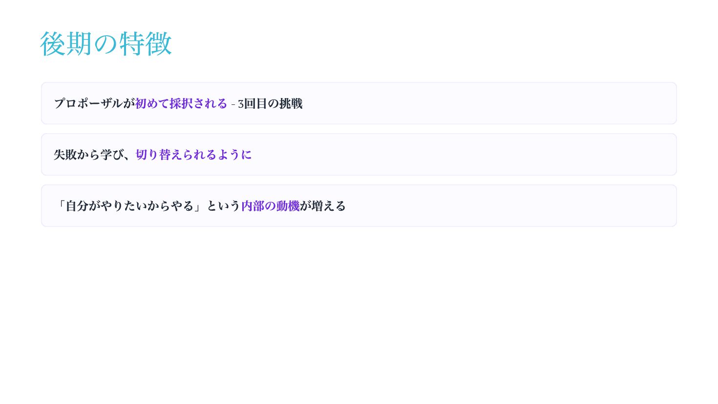 後期の特徴 プロポーザルが初めて採択される - 3 回目の挑戦 失敗から学び、切り替えられるように 「自分がやりたいからやる」という内部の動機が増える