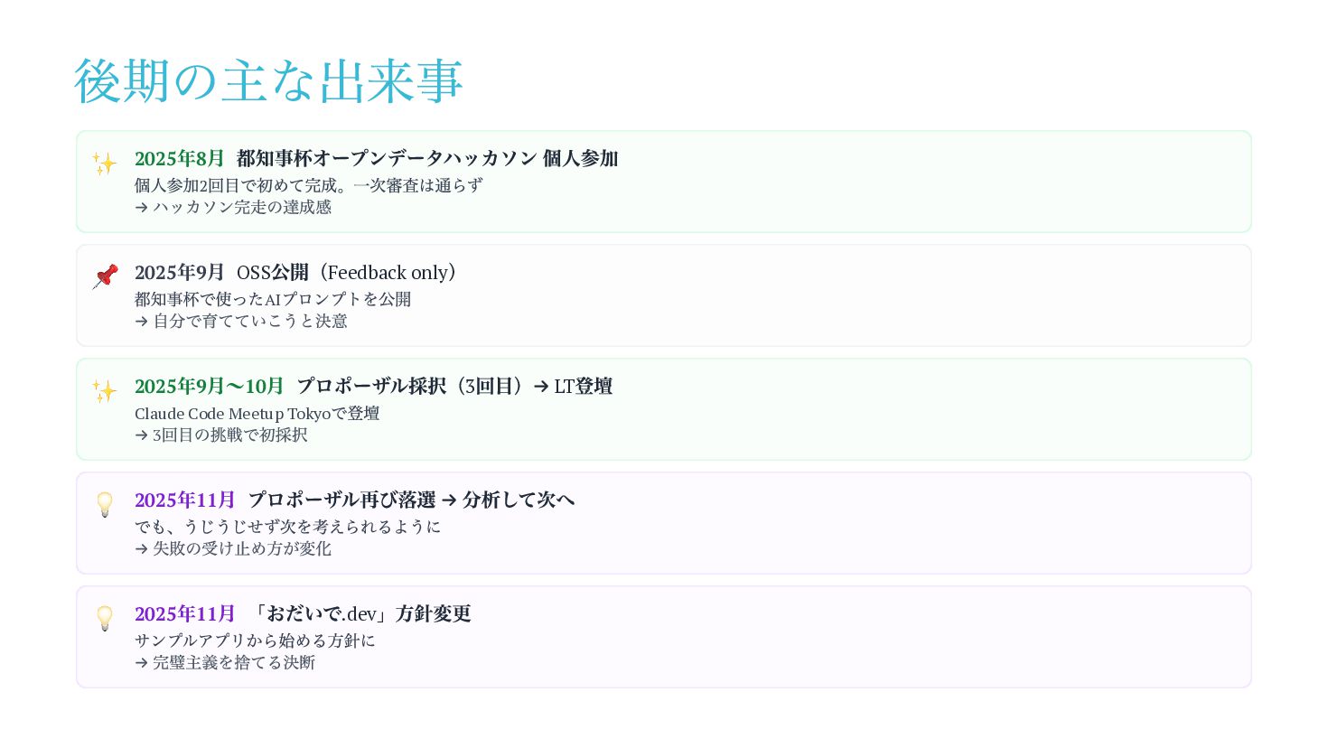 ハッカソン完走の達成感 📌 2025 年9 月 OSS 公開(Feedback only ) 都知事杯で使ったAI プロンプトを公開 → 自分で育てていこうと決意 ✨ 2025 年9 月〜10 月 プロポーザル採択(3 回目)→ LT 登壇 Claude Code Meetup Tokyo で登壇 → 3 回目の挑戦で初採択 💡 2025 年11 月 プロポーザル再び落選 → 分析して次へ でも、うじうじせず次を考えられるように → 失敗の受け止め方が変化 💡 2025 年11 月 「おだいで.dev 」方針変更 サンプルアプリから始める方針に → 完璧主義を捨てる決断
