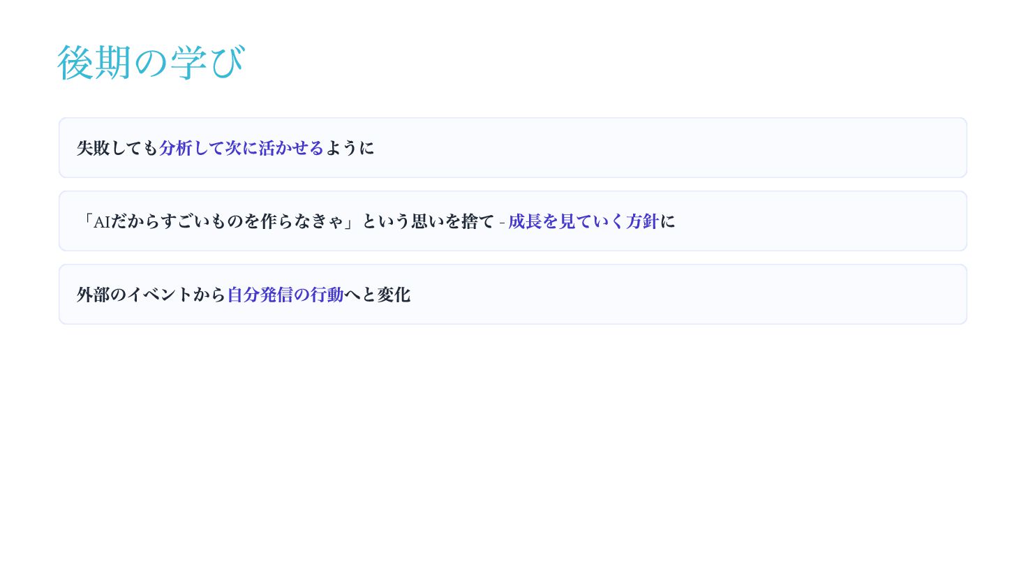 後期の学び 失敗しても分析して次に活かせるように 「AI だからすごいものを作らなきゃ」という思いを捨て - 成長を見ていく方針に 外部のイベントから自分発信の行動へと変化