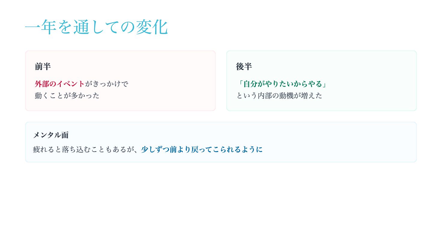 一年を通しての変化 前半 外部のイベントがきっかけで 動くことが多かった 後半 「自分がやりたいからやる」 という内部の動機が増えた メンタル面 疲れると落ち込むこともあるが、少しずつ前より戻ってこられるように