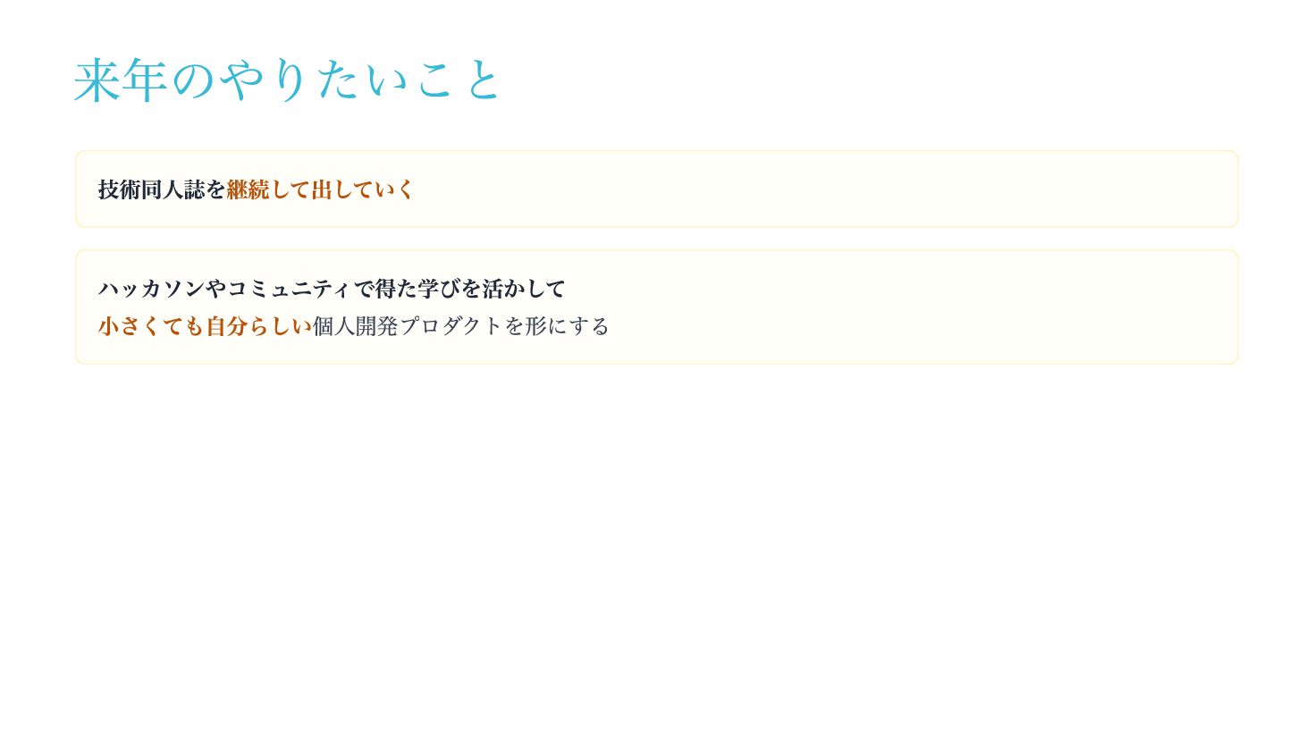 来年のやりたいこと 技術同人誌を継続して出していく ハッカソンやコミュニティで得た学びを活かして 小さくても自分らしい個人開発プロダクトを形にする