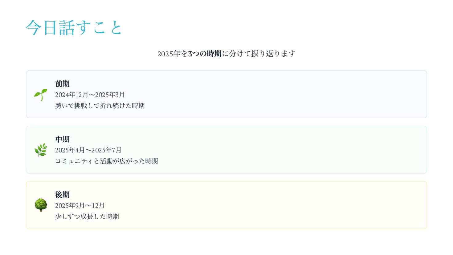 今日話すこと 2025 年を3 つの時期に分けて振り返ります 🌱 前期 2024 年12 月〜2025 年3