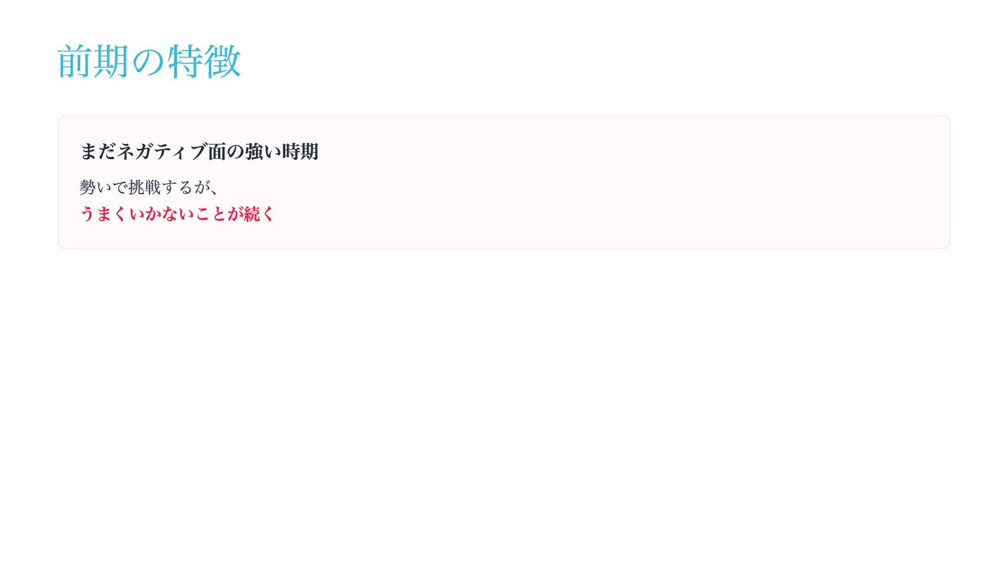 前期の特徴 まだネガティブ面の強い時期 勢いで挑戦するが、 うまくいかないことが続く