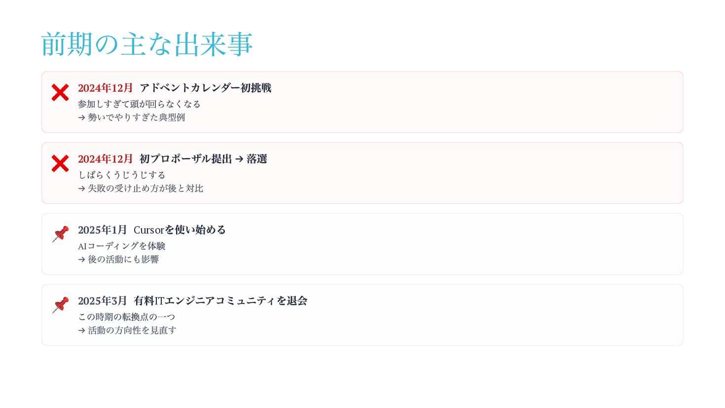 2024 年12 月 初プロポーザル提出 → 落選 しばらくうじうじする → 失敗の受け止め方が後と対比 📌 2025 年1 月 Cursor を使い始める AI コーディングを体験 → 後の活動にも影響 📌 2025 年3 月 有料IT エンジニアコミュニティを退会 この時期の転換点の一つ → 活動の方向性を見直す