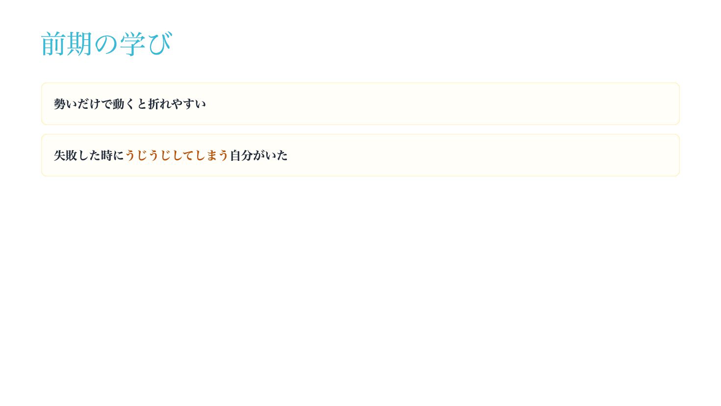 前期の学び 勢いだけで動くと折れやすい 失敗した時にうじうじしてしまう自分がいた
