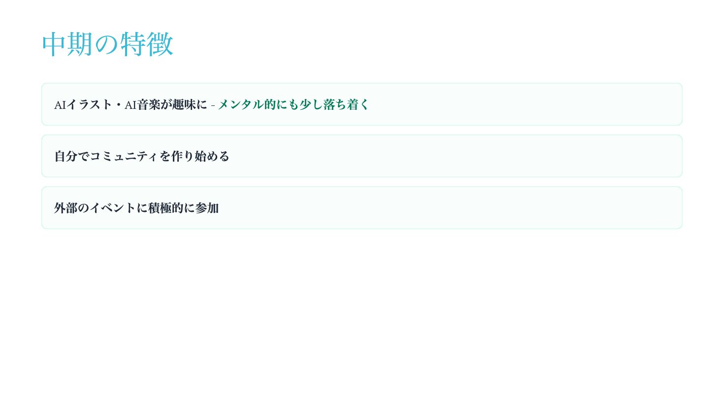 中期の特徴 AI イラスト・AI 音楽が趣味に - メンタル的にも少し落ち着く 自分でコミュニティを作り始める 外部のイベントに積極的に参加
