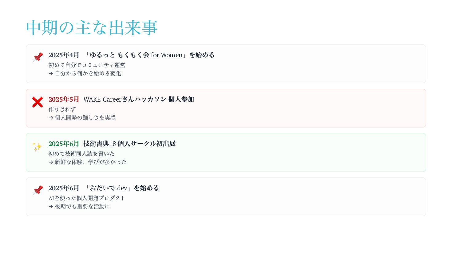 中期の主な出来事 📌 2025 年4 月 「ゆるっと もくもく会 for Women 」を始める
