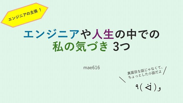 概要: 真面目な話でなく、ちょっとした小話です。エンジニアをする中で自身が大事だと感じたことを3つ、ジェンダーに関わるものも技術的なこともありでお話しします