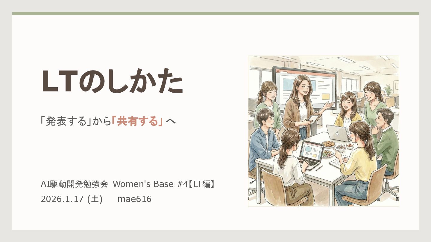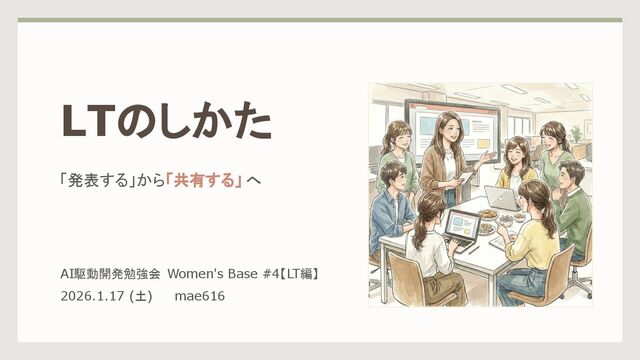 LTのしかた 「発表する」から「共有する」 へ AI駆動開発勉強会 Women's Base #4【LT編】 2026.1.17 (土) mae616