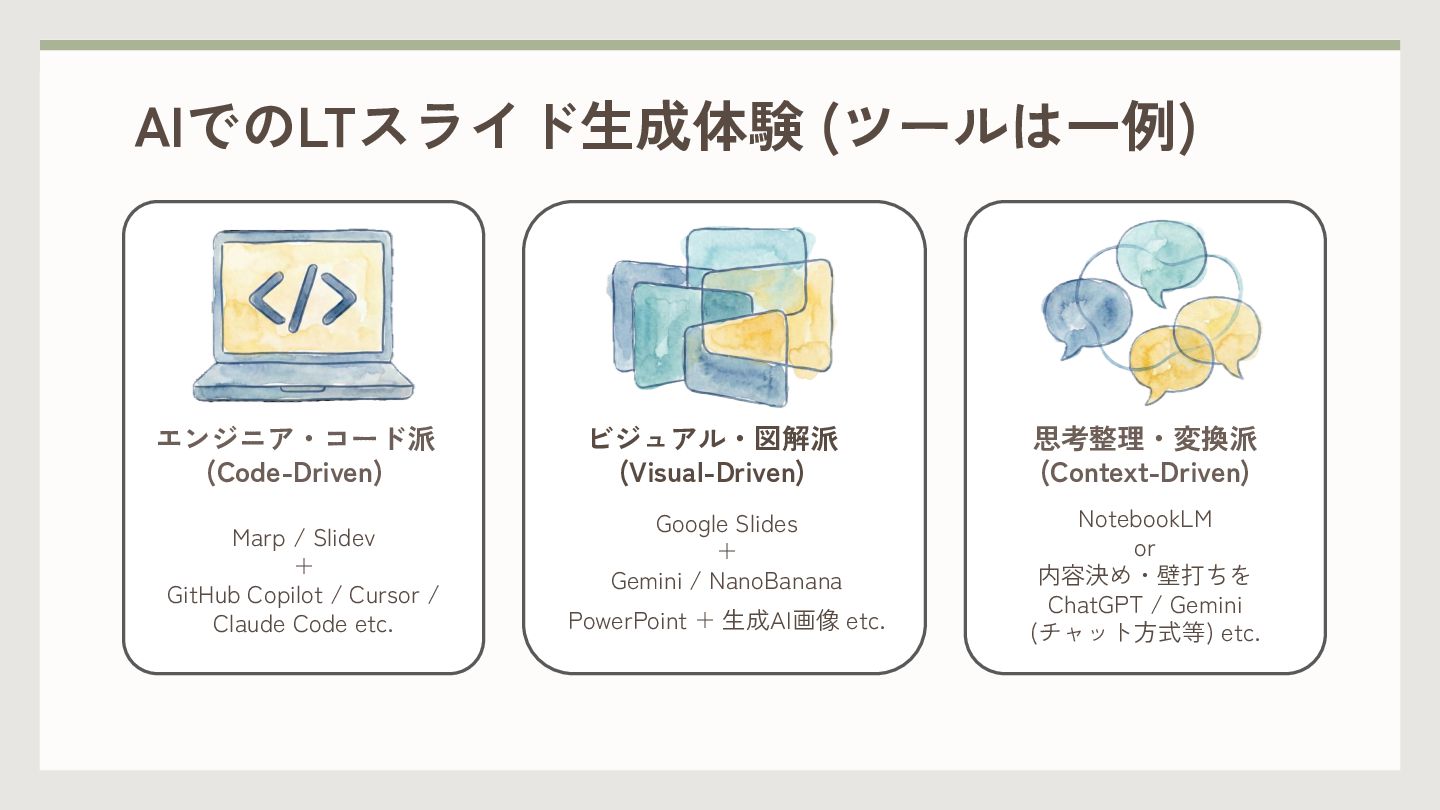 / Cursor / Claude Code etc. ビジュアル・図解派 (Visual-Driven) Google Slides + Gemini / NanoBanana PowerPoint + 生成AI画像 etc. 思考整理・変換派 (Context-Driven) NotebookLM or 内容決め・壁打ちを ChatGPT / Gemini (チャット方式等) etc.