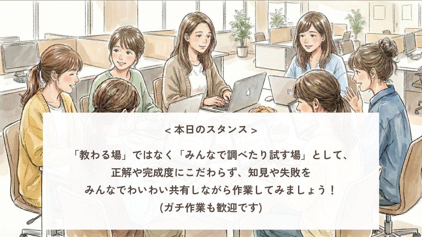 < 本日のスタンス > 「教わる場」ではなく「みんなで調べたり試す場」として、 正解や完成度にこだわらず、知見や失敗を みんなでわいわい共有しながら作業してみましょう! (ガチ作業も歓迎です)