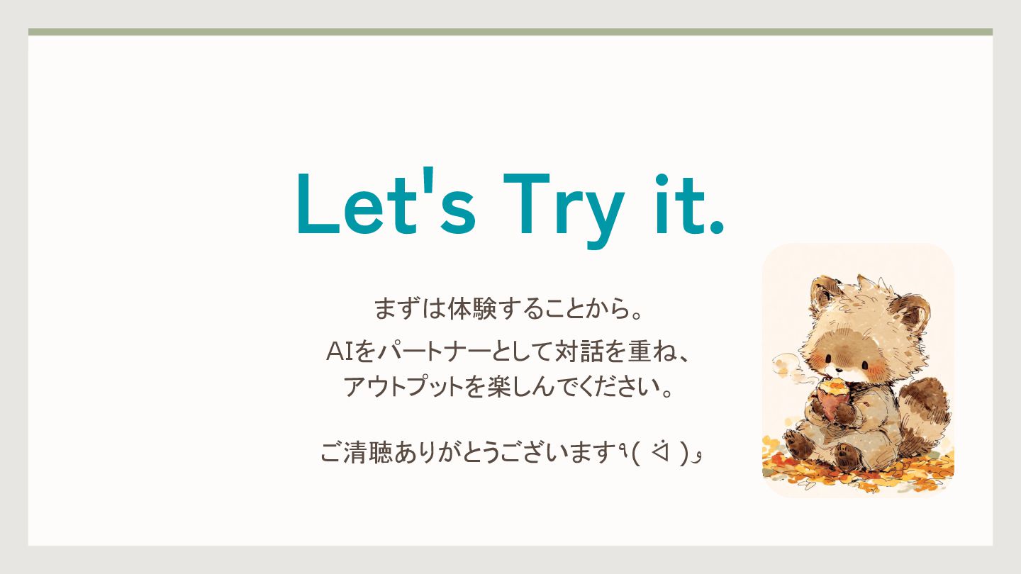 Let's Try it. まずは体験することから。 AIをパートナーとして対話を重ね、 アウトプットを楽しんでください。 ご清聴ありがとうございます٩( ᐛ )و