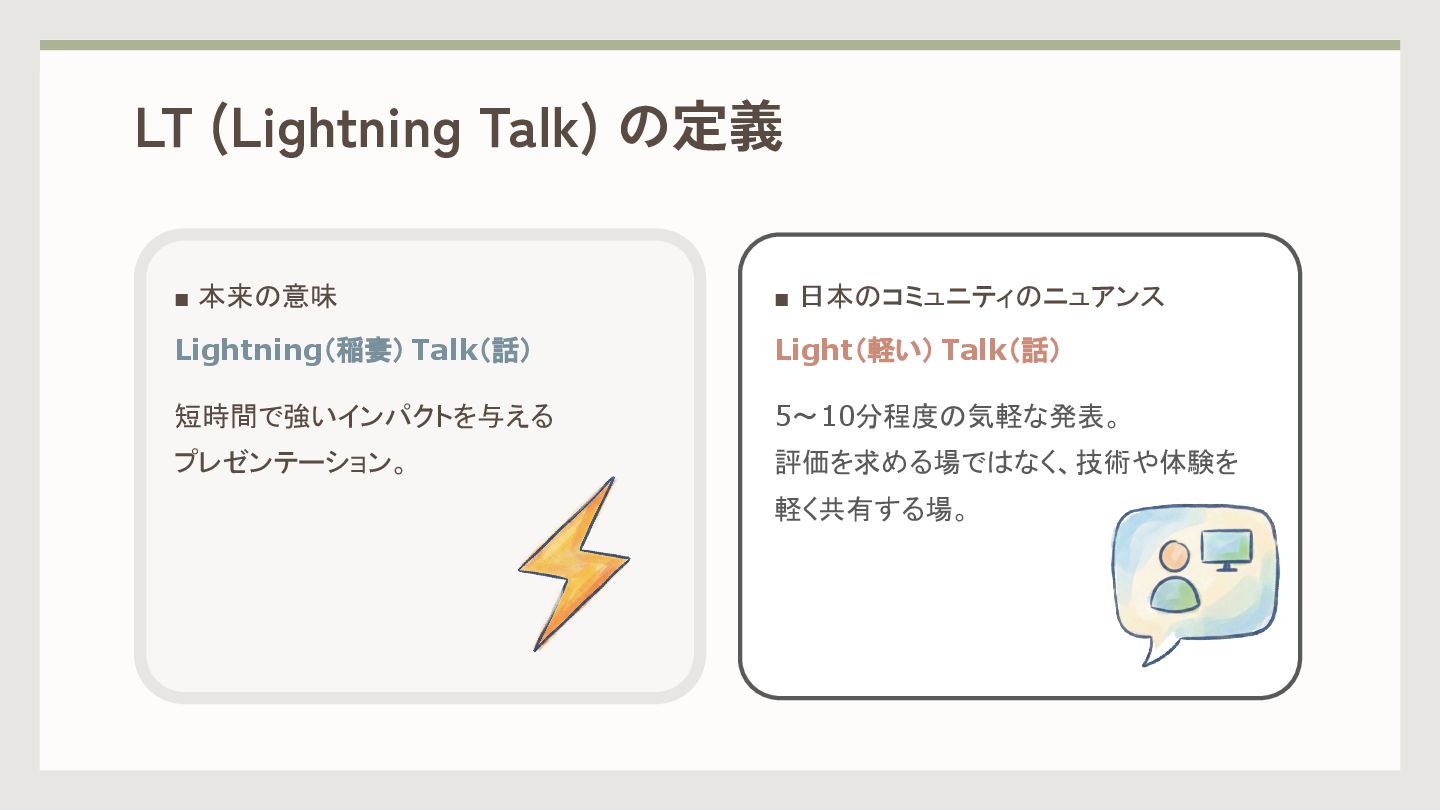 ▪ 日本のコミュニティのニュアンス Light(軽い) Talk(話) 5〜10分程度の気軽な発表。 評価を求める場ではなく、技術や体験を 軽く共有する場。