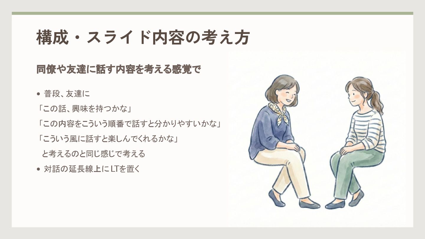 構成・スライド内容の考え方 同僚や友達に話す内容を考える感覚で • 普段、友達に 「この話、興味を持つかな」 「この内容をこういう順番で話すと分かりやすいかな」 「こういう風に話すと楽しんでくれるかな」 と考えるのと同じ感じで考える • 対話の延長線上にLTを置く