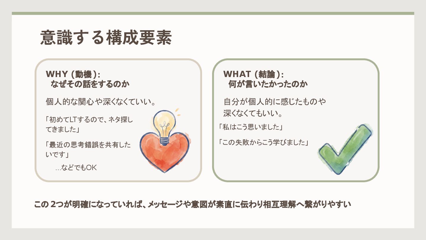 この2つが明確になっていれば、メッセージや意図が素直に伝わり相互理解へ繋がりやすい 「初めてLTするので、ネタ探し てきました」 「最近の思考錯誤を共有した いです」 …などでもOK 「私はこう思いました」 「この失敗からこう学びました」