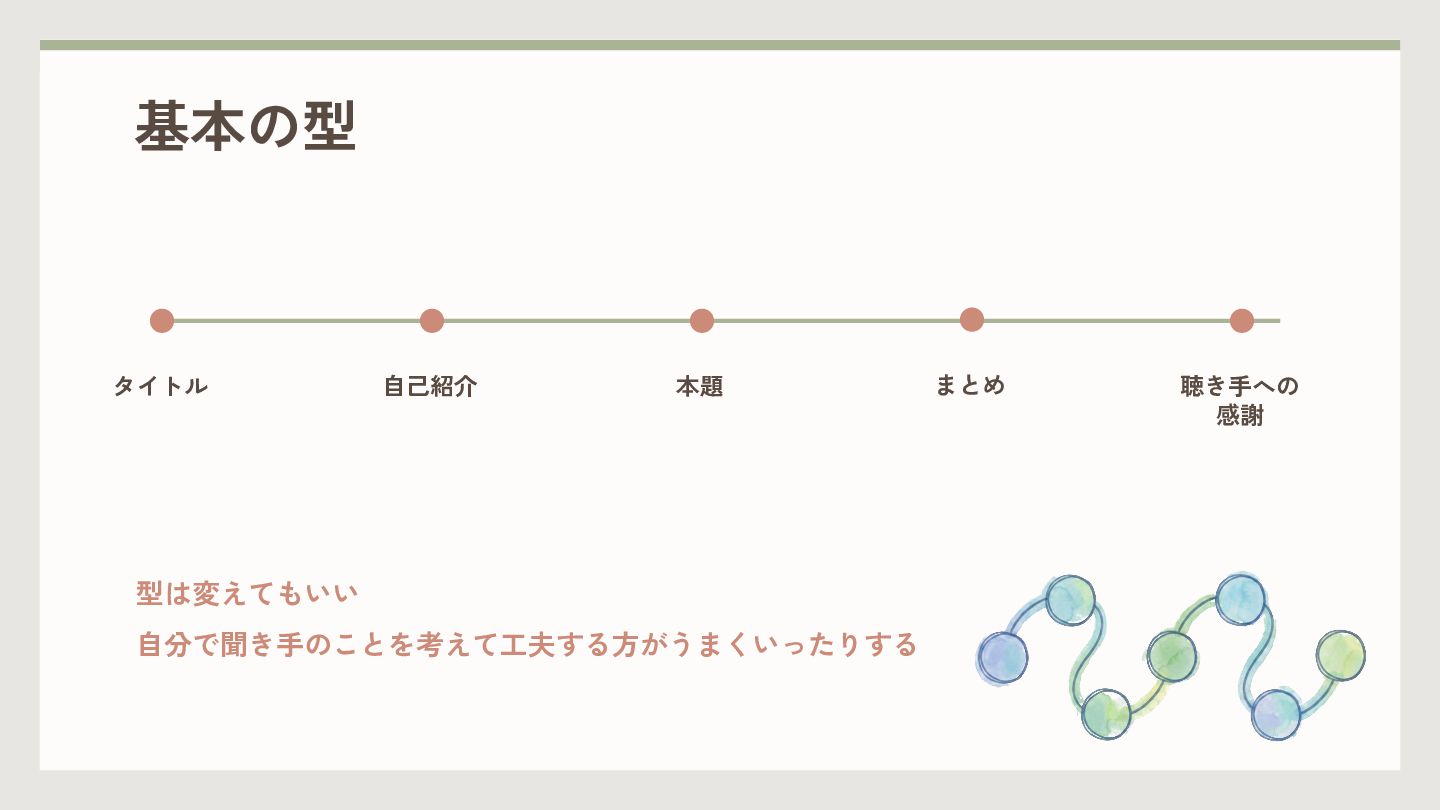 基本の型 型は変えてもいい 自分で聞き手のことを考えて工夫する方がうまくいったりする タイトル 自己紹介 本題 聴き手への 感謝 まとめ