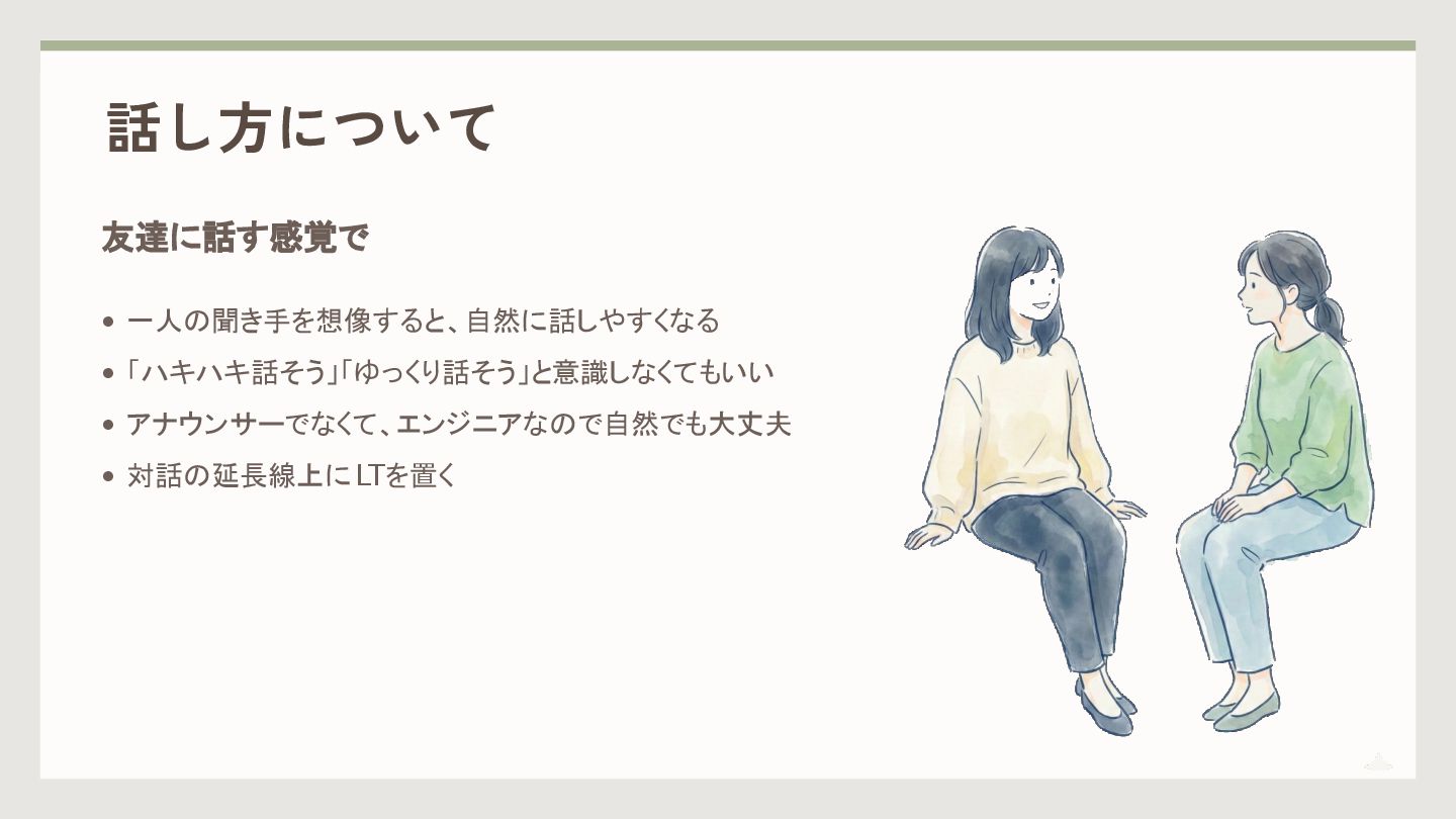 話し方について 友達に話す感覚で • 一人の聞き手を想像すると、自然に話しやすくなる • 「ハキハキ話そう」「ゆっくり話そう」と意識しなくてもいい • アナウンサーでなくて、エンジニアなので自然でも大丈夫 • 対話の延長線上にLTを置く