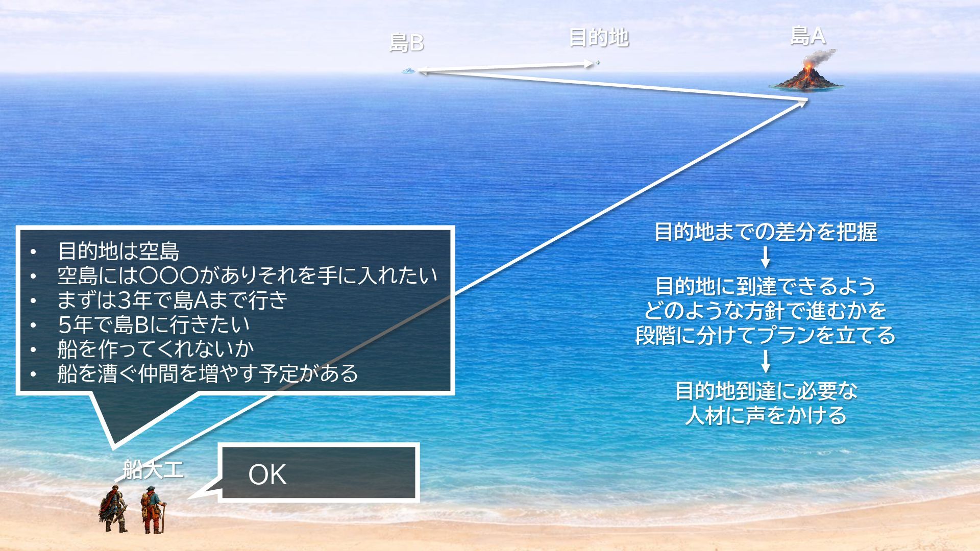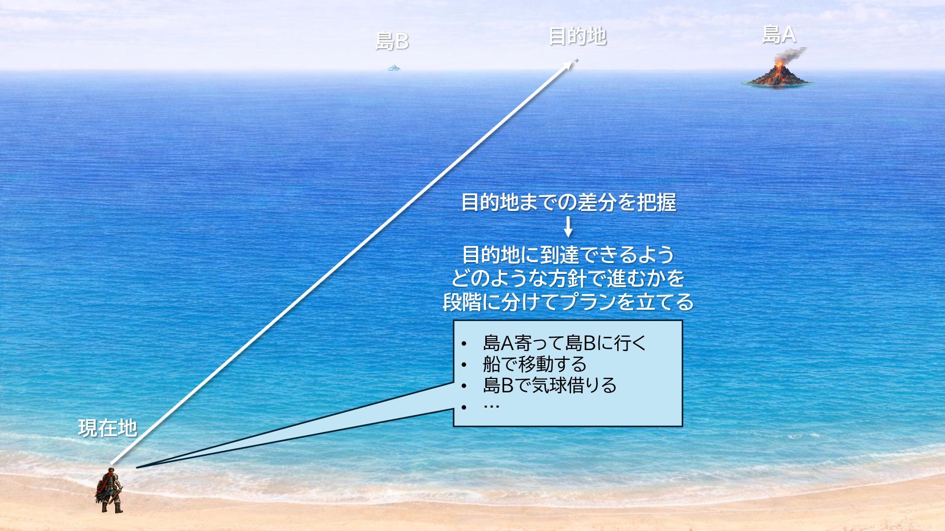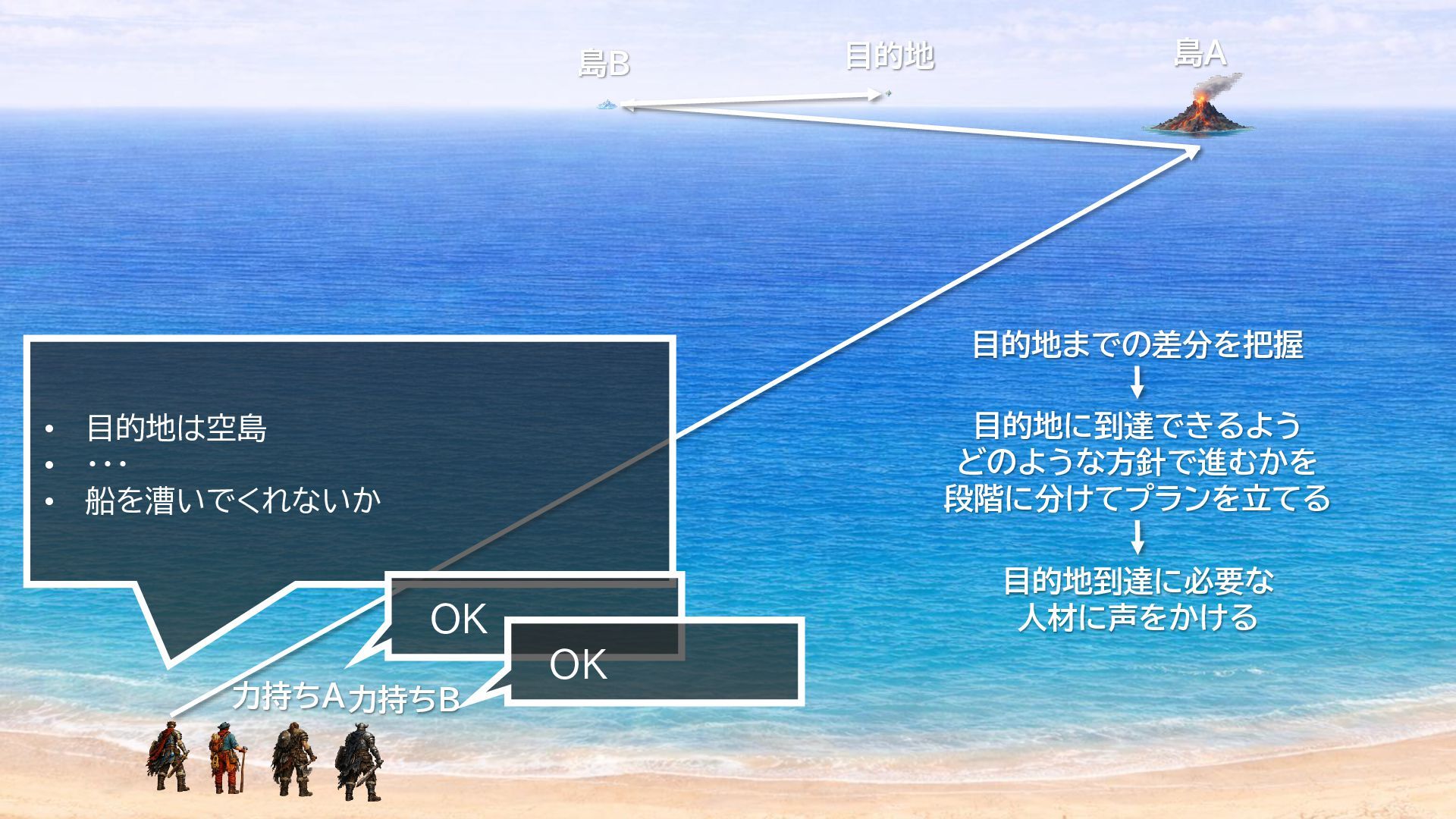 島A 島B 目的地 力持ちB 目的地に到達できるよう どのような方針で進むかを 段階に分けてプランを立てる 目的地までの差分を把握 目的地到達に必要な 人材に声をかける