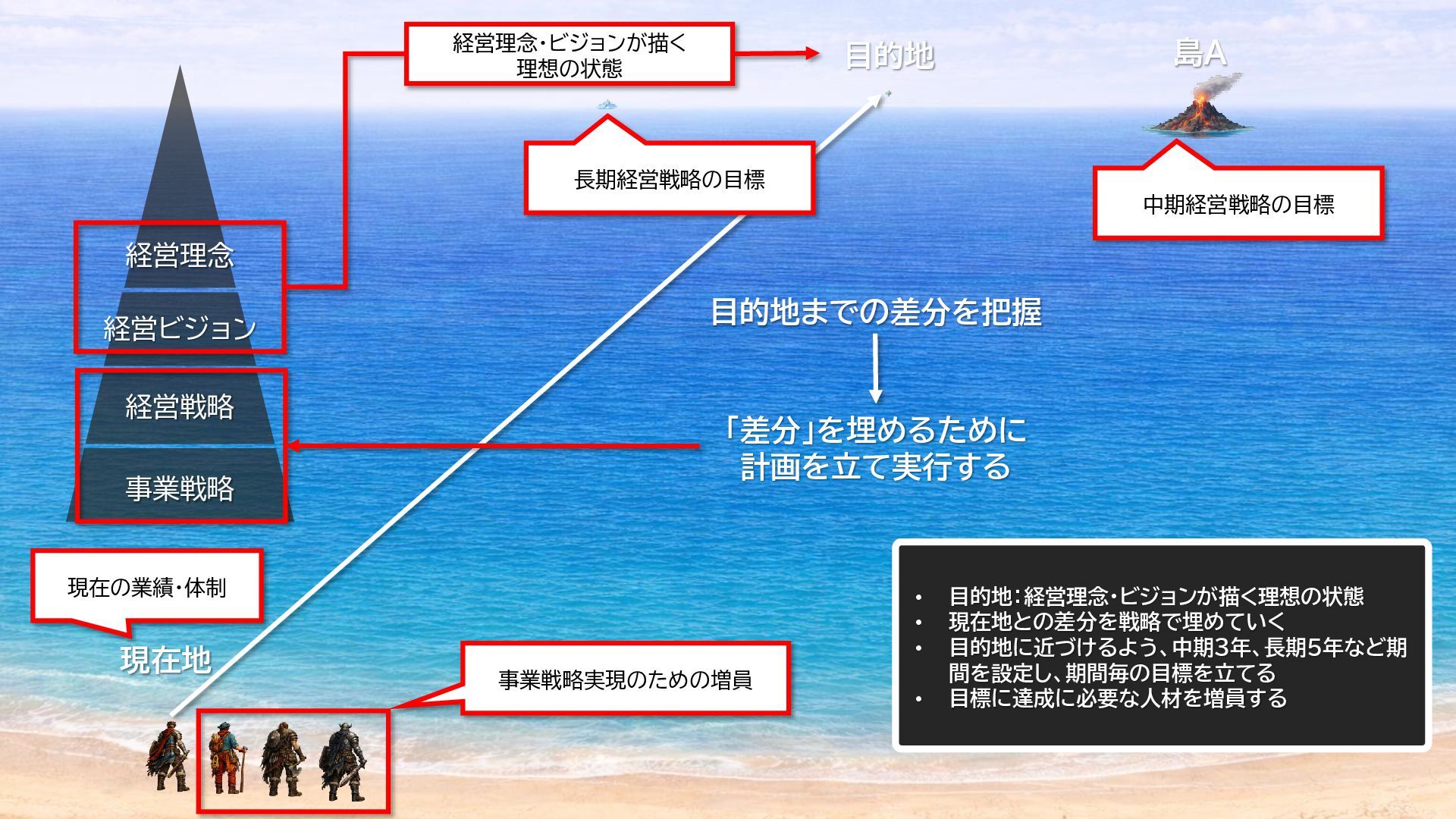 目的地 島A 中期経営戦略の目標 長期経営戦略の目標 • 目的地:経営理念・ビジョンが描く理想の状態 • 現在地との差分を戦略で埋めていく • 目的地に近づけるよう、中期3年、長期5年など期 間を設定し、期間毎の目標を立てる • 目標に達成に必要な人材を増員する 現在の業績・体制 目的地までの差分を把握