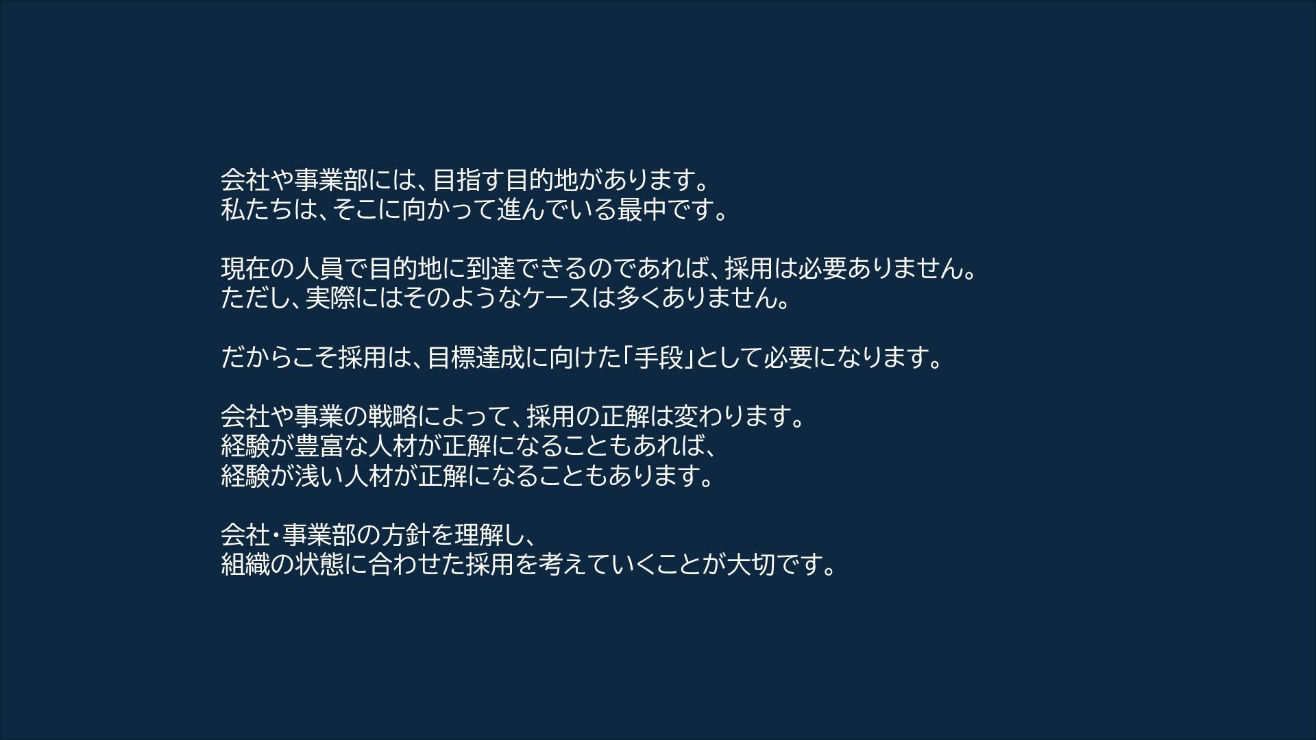 会社や事業部には、目指す目的地があります。 私たちは、そこに向かって進んでいる最中です。 現在の人員で目的地に到達できるのであれば、採用は必要ありません。 ただし、実際にはそのようなケースは多くありません。 だからこそ採用は、目標達成に向けた「手段」として必要になります。 会社や事業の戦略によって、採用の正解は変わります。 経験が豊富な人材が正解になることもあれば、 経験が浅い人材が正解になることもあります。 会社・事業部の方針を理解し、 組織の状態に合わせた採用を考えていくことが大切です。
