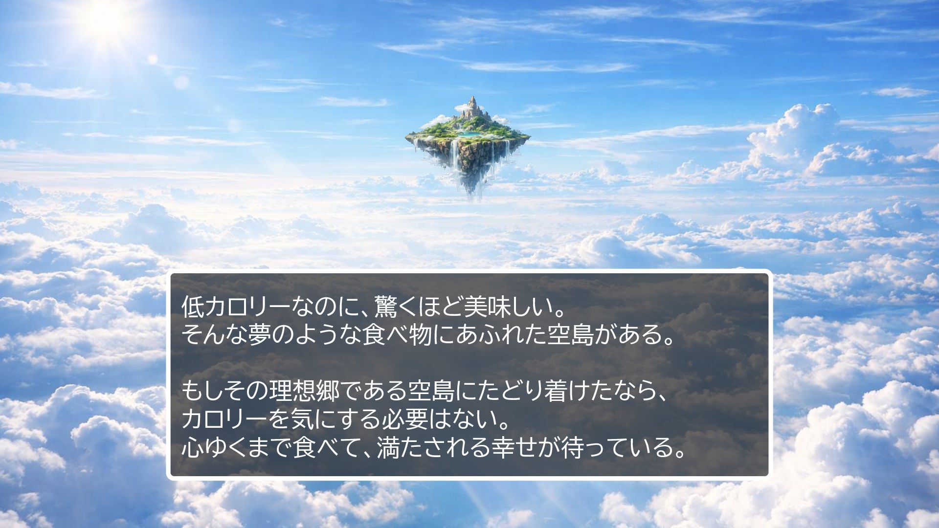低カロリーなのに、驚くほど美味しい。 そんな夢のような食べ物にあふれた空島がある。 もしその理想郷である空島にたどり着けたなら、 カロリーを気にする必要はない。 心ゆくまで食べて、満たされる幸せが待っている。