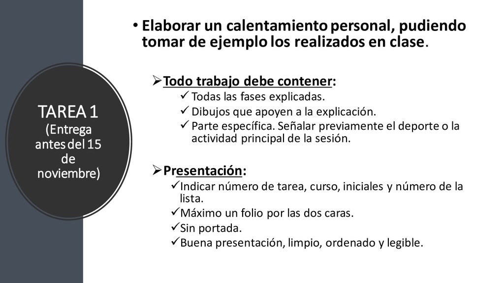 un calentamiento personal, pudiendo tomar de ejemplo los realizados en clase. ➢Todo trabajo debe contener: ✓ Todas las fases explicadas. ✓ Dibujos que apoyen a la explicación. ✓ Parte específica. Señalar previamente el deporte o la actividad principal de la sesión. ➢Presentación: ✓Indicar número de tarea, curso, iniciales y número de la lista. ✓Máximo un folio por las dos caras. ✓Sin portada. ✓Buena presentación, limpio, ordenado y legible.