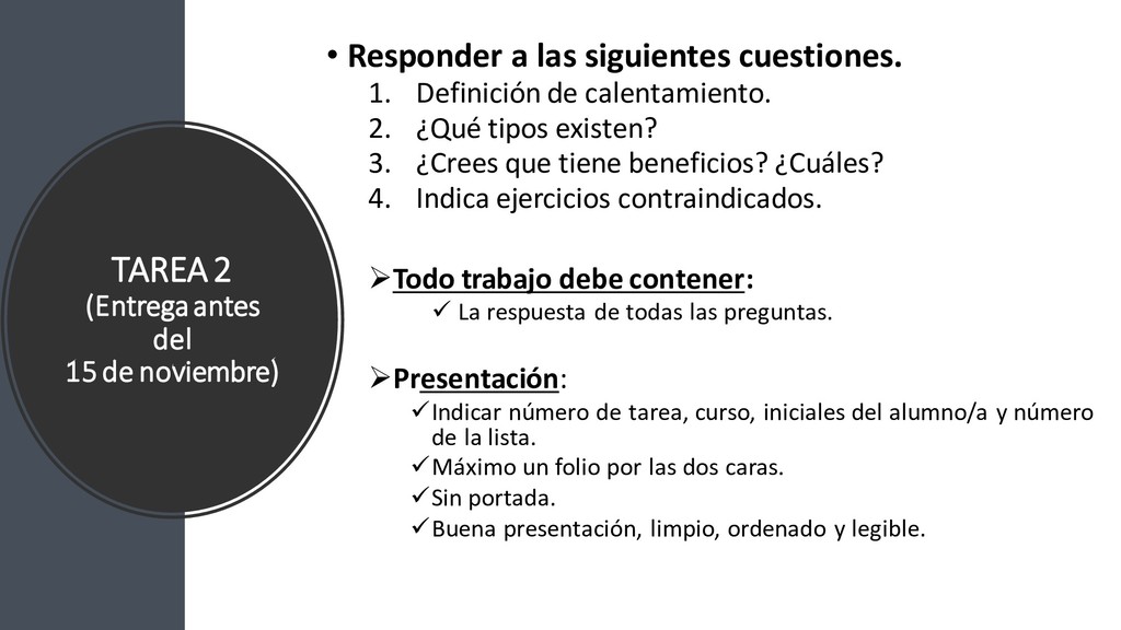 las siguientes cuestiones. 1. Definición de calentamiento. 2. ¿Qué tipos existen? 3. ¿Crees que tiene beneficios? ¿Cuáles? 4. Indica ejercicios contraindicados. ➢Todo trabajo debe contener: ✓ La respuesta de todas las preguntas. ➢Presentación: ✓Indicar número de tarea, curso, iniciales del alumno/a y número de la lista. ✓Máximo un folio por las dos caras. ✓Sin portada. ✓Buena presentación, limpio, ordenado y legible.