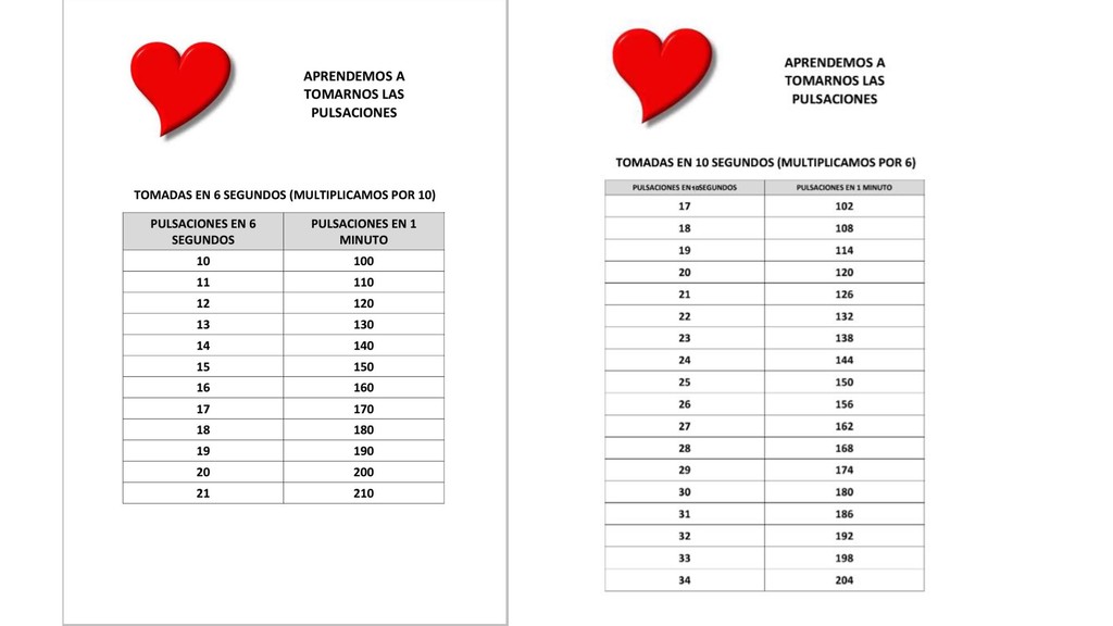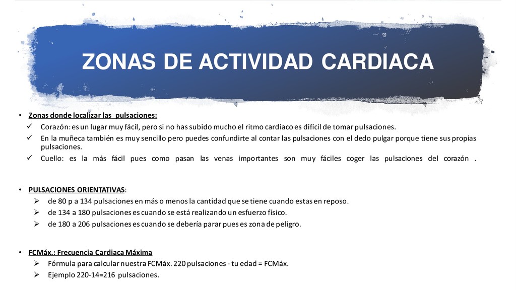 ✓ Corazón:es un lugar muy fácil, pero si no has subido mucho el ritmo cardiaco es difícil de tomar pulsaciones. ✓ En la muñeca también es muy sencillo pero puedes confundirte al contar las pulsaciones con el dedo pulgar porque tiene sus propias pulsaciones. ✓ Cuello: es la más fácil pues como pasan las venas importantes son muy fáciles coger las pulsaciones del corazón . • PULSACIONES ORIENTATIVAS: ➢ de 80 p a 134 pulsaciones en más o menos la cantidad que se tiene cuando estas en reposo. ➢ de 134 a 180 pulsaciones es cuando se está realizando un esfuerzo físico. ➢ de 180 a 206 pulsaciones es cuando se debería parar pues es zona de peligro. • FCMáx.: Frecuencia Cardiaca Máxima ➢ Fórmula para calcularnuestra FCMáx.220pulsaciones - tu edad = FCMáx. ➢ Ejemplo 220-14=216 pulsaciones.