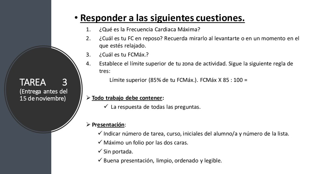 las siguientes cuestiones. 1. ¿Qué es la Frecuencia Cardiaca Máxima? 2. ¿Cuál es tu FC en reposo? Recuerda mirarlo al levantarte o en un momento en el que estés relajado. 3. ¿Cuál es tu FCMáx.? 4. Establece el límite superior de tu zona de actividad. Sigue la siguiente regla de tres: Límite superior (85% de tu FCMáx.). FCMáx X 85 : 100 = ➢ Todo trabajo debe contener: ✓ La respuesta de todas las preguntas. ➢ Presentación: ✓ Indicar número de tarea, curso, iniciales del alumno/a y número de la lista. ✓ Máximo un folio por las dos caras. ✓ Sin portada. ✓ Buena presentación, limpio, ordenado y legible.
