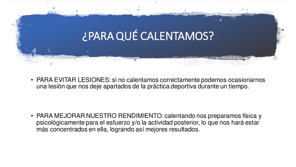 correctamente podemos ocasionarnos una lesión que nos deje apartados de la práctica deportiva durante un tiempo. • PARA MEJORAR NUESTRO RENDIMIENTO: calentando nos preparamos física y psicológicamente para el esfuerzo y/o la actividad posterior, lo que nos hará estar más concentrados en ella, logrando así mejores resultados.