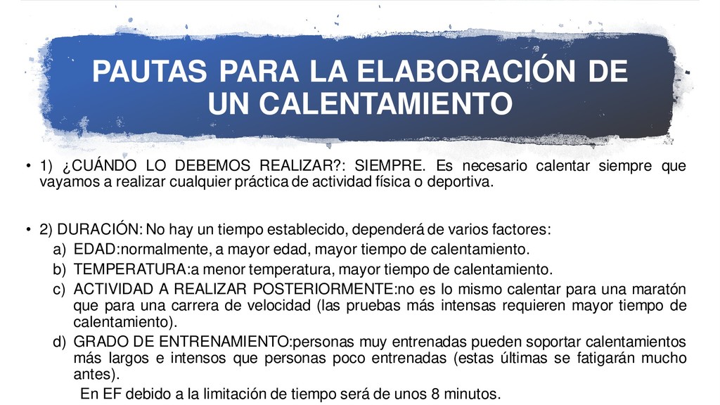 LO DEBEMOS REALIZAR?: SIEMPRE. Es necesario calentar siempre que vayamos a realizar cualquier práctica de actividad física o deportiva. • 2) DURACIÓN: No hay un tiempo establecido, dependerá de varios factores: a) EDAD:normalmente, a mayor edad, mayor tiempo de calentamiento. b) TEMPERATURA:a menor temperatura, mayor tiempo de calentamiento. c) ACTIVIDAD A REALIZAR POSTERIORMENTE:no es lo mismo calentar para una maratón que para una carrera de velocidad (las pruebas más intensas requieren mayor tiempo de calentamiento). d) GRADO DE ENTRENAMIENTO:personas muy entrenadas pueden soportar calentamientos más largos e intensos que personas poco entrenadas (estas últimas se fatigarán mucho antes). En EF debido a la limitación de tiempo será de unos 8 minutos.