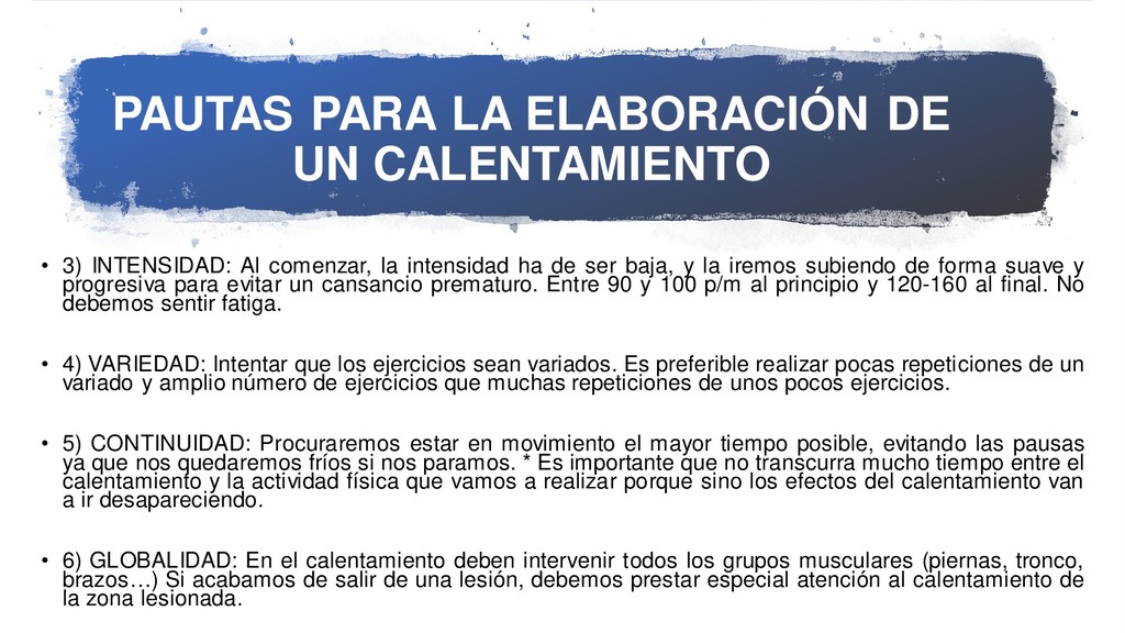 Al comenzar, la intensidad ha de ser baja, y la iremos subiendo de forma suave y progresiva para evitar un cansancio prematuro. Entre 90 y 100 p/m al principio y 120-160 al final. No debemos sentir fatiga. • 4) VARIEDAD: Intentar que los ejercicios sean variados. Es preferible realizar pocas repeticiones de un variado y amplio número de ejercicios que muchas repeticiones de unos pocos ejercicios. • 5) CONTINUIDAD: Procuraremos estar en movimiento el mayor tiempo posible, evitando las pausas ya que nos quedaremos fríos si nos paramos. * Es importante que no transcurra mucho tiempo entre el calentamiento y la actividad física que vamos a realizar porque sino los efectos del calentamiento van a ir desapareciendo. • 6) GLOBALIDAD: En el calentamiento deben intervenir todos los grupos musculares (piernas, tronco, brazos…) Si acabamos de salir de una lesión, debemos prestar especial atención al calentamiento de la zona lesionada.