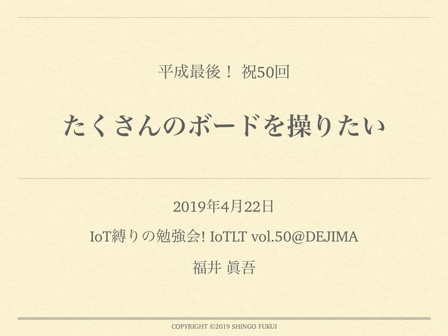 COPYRIGHT ©2019 SHINGO FUKUI ͨ͘͞ΜͷϘʔυΛૢΓ͍ͨ 20194݄22 IoTറΓͷษڧձ! IoTLT vol.50@DEJIMA Ҫ
