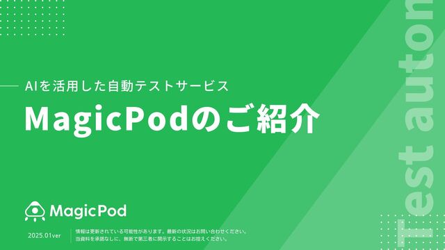 MagicPodのご紹介 AIを活用した自動テストサービス Test auto 2025.01ver 情報は更新されている可能性があります。最新の状況はお問い合わせください。 当資料を承諾なしに、無断で第三者に開示することはお控えください。