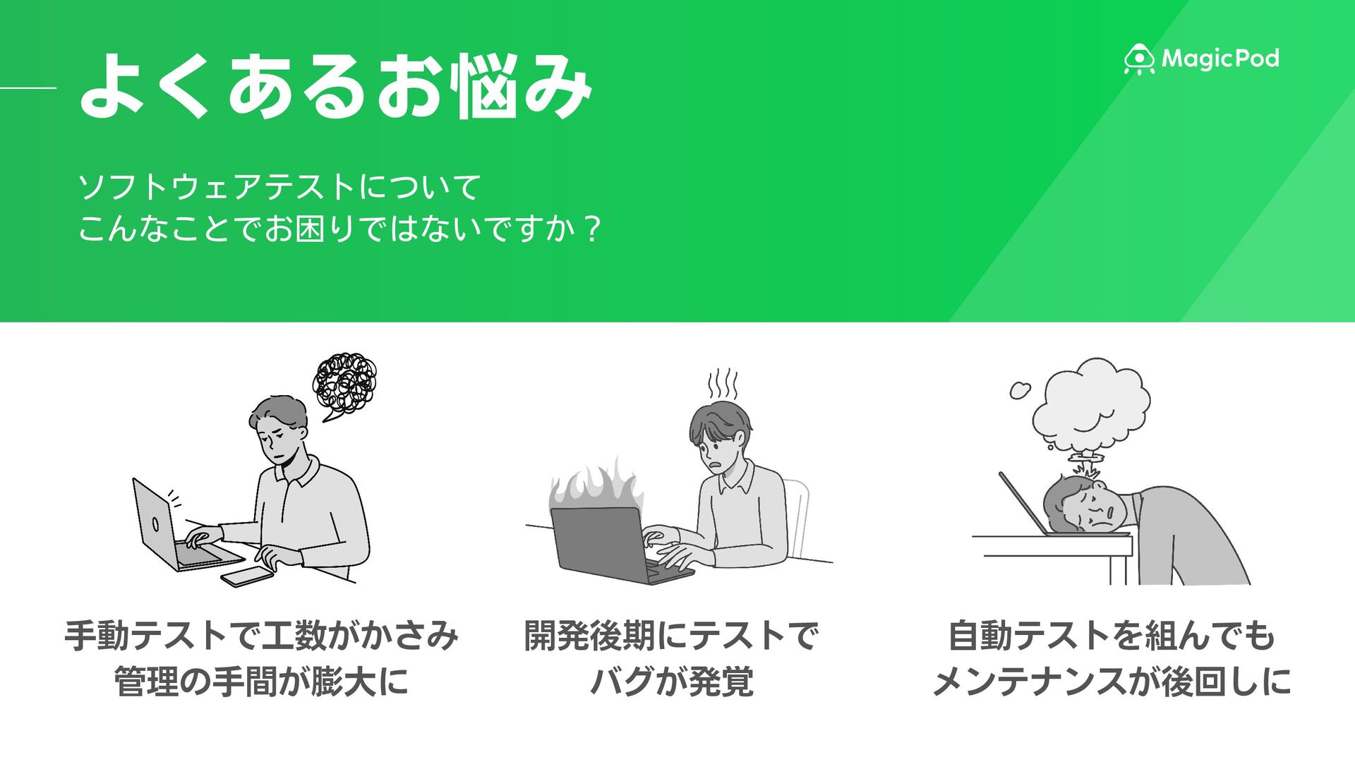 よくあるお悩み ソフトウェアテストについて こんなことでお困りではないですか? 手動テストで工数がかさみ 管理の手間が膨大に 開発後期にテストで バグが発覚 自動テストを組んでも メンテナンスが後回しに