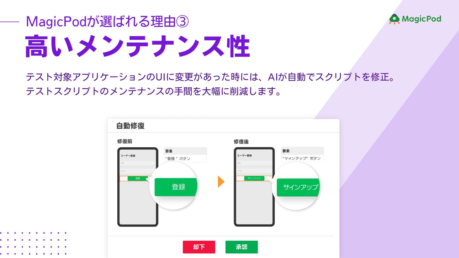 テスト対象アプリケーションのUIに変更があった時には、AIが自動でスクリプトを修正。 テストスクリプトのメンテナンスの手間を大幅に削減します。 高いメンテナンス性 MagicPodが選ばれる理由③